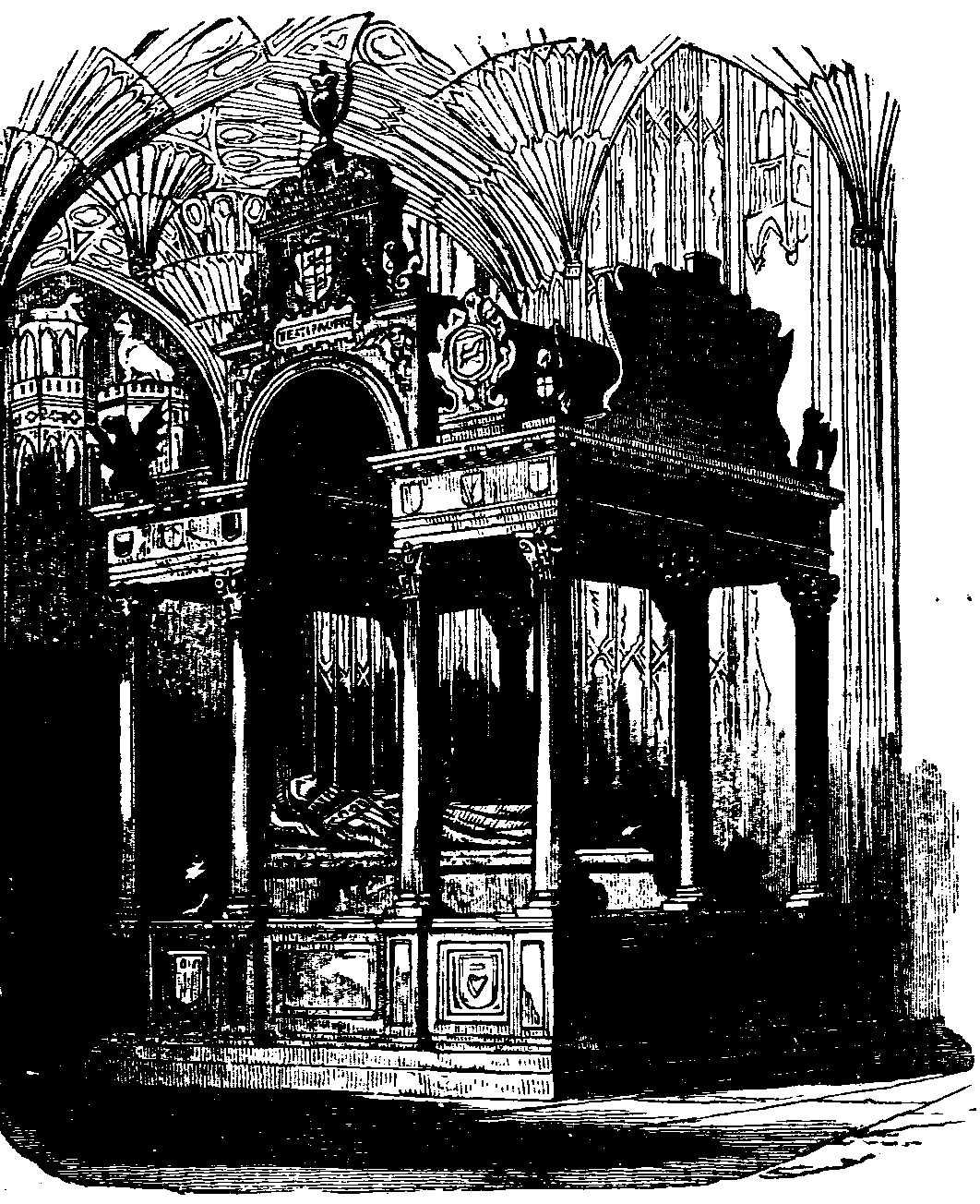 In due time the body of the deceased queen was deposited with those of its progenitors, in the ancient place of sepulture of the English kings. Westminster Abbey. Westminster Abbey, in the sense in which that term is used in history, is not to be conceived of as a building, nor even as a group of buildings, but rather as a long succession of buildings like a dynasty, following each other in a line, the various structures having been renewed and rebuilt constantly, as parts or wholes decayed, from century to century, for twelve or fifteen hundred years. The spot received its consecration at a very early day. It was then an island formed by the waters of a little tributary to the Thames, which has long since entirely disappeared. Written records of its sacredness, and of the sacred structures which have occupied it, go back more than a thousand years, and beyond that time tradition mounts still further, carrying the consecration of the spot almost to the Christian era, by telling us that the Apostle Peter himself, in his missionary wanderings, had a chapel or an oratory there. The spot has been, in all ages, the great burial-place of the English kings, whose monuments and effigies adorn its walls and aisles in endless variety. A vast number, too, of the statesmen, generals, and naval heroes of the British empire have been admitted to the honor of having their remains deposited under its marble floor. Even literary genius has a little corner assigned it—the mighty aristocracy whose mortal remains it is the main function of the building to protect having so far condescended toward intellectual greatness as to allow to Milton, Addison, and Shakespeare modest monuments behind a door. The place is called the Poets' Corner; and so famed and celebrated is this vast edifice every where, that the phrase by which even this obscure and insignificant portion of it is known is familiar to every ear and every tongue throughout the English world. The body of Elizabeth was interred in a part of the edifice called Henry the Seventh's Chapel. The word chapel, in the European sense, denotes ordinarily a subordinate edifice connected with the main body of a church, and opening into it. Most frequently, in fact, a chapel is a mere recess or alcove, separated from the area of the church by a small screen or gilded iron railing. In the Catholic churches these chapels are ornamented with sculptures and paintings, with altars and crucifixes, and other such furniture. Sometimes they are built expressly as monumental structures, in which case they are often of considerable size, and are ornamented with great magnificence and splendor. This was the case with Henry the Seventh's Chapel. The whole building is, in fact, his tomb. Vast sums were expended in the construction of it, the work of which extended through two reigns. It is now one of the most attractive portions of the great pile which it adorns. Elizabeth's body was deposited here, and here her monument was erected. It will be recollected that James, who now succeeded Elizabeth, was the son of Mary Queen of Scots. Soon after his accession to the throne, he removed the remains of his mother from their place of sepulture near the scene of her execution, and interred them in the south aisle of Henry the Seventh's Chapel, while the body of Elizabeth occupied the northern one.