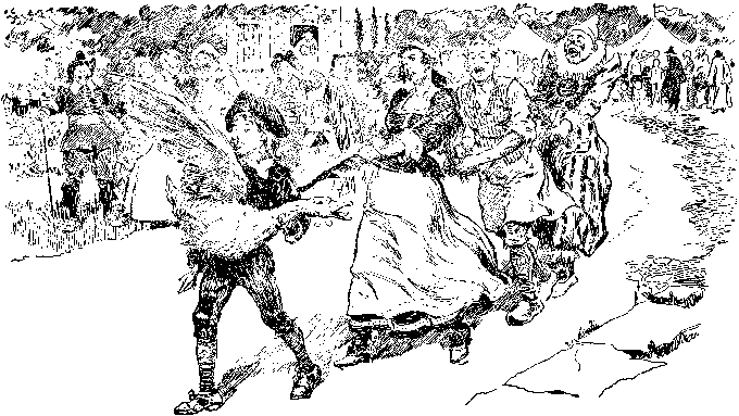 "What do you mean by grinning at me?" he said; and he seized the fellow's coat tail and tried to stop him. But at that moment the goose screamed, and Peter cried out: "Hold fast! hold fast! hold fast!" What could the Mayor do but follow Peter with the rest? For, try as hard as he would, he could not let go. The wife of the Mayor, a tall, spare woman, was greatly vexed when she saw her husband marching along and hanging to the clown's coat tail. She ran after him and seized his free arm and tried her best to pull him away. The goose screamed, and Peter, without looking back, cried out: "Hold fast! hold fast! hold fast!" The good lady could not help herself. She had to walk along whether she would or not, and make the best of it. A great many people followed, laughing and wondering, but none of them wanted to touch the Mayor's wife; for she kept her tongue going very fast, you may be sure. In a little while, Peter came in sight of the King's palace. Just before reaching the gates he met a fine carriage drawn by four white horses; and in the carriage sat a young lady, as beautiful as a summer day, but with a sad and solemn look. Peter and his train stepped aside to let the carriage pass, and just then the young lady looked out. When she saw the goose, and the funny way in which so many people had to walk behind it, she burst into a loud laugh. Then she ordered the coachman to stop, so that she might see better, and the longer she looked, the harder she laughed. "The Princess has laughed! The Princess has laughed!" cried all the servants that were with her; and one of them ran back to tell the King about it. When the King heard what had happened he was so delighted that he ran out to see and hear for himself; and when he saw Peter and his train he was so amused that he laughed louder than anybody else. "My good friend," he said to Peter, "which will you choose?" Peter stared at him and said nothing, for he did not know what the King meant. "Do you know what I promised to the one who would make my daughter laugh?" said the King. "No, I don't think I do," said Peter. "I promised a thousand dollars or a piece of land," said the King. "Which will you choose?" "I think I'll take the land," said Peter. Then he stroked the goose's head, and in a moment the girl and the stable boy and the clown and the Mayor and the Mayor's wife were free. They were so glad to get away that they ran home as though a fire were behind them. "What a pretty bird!" said the Princess as she stepped out of her carriage and came to look at the goose. Then she reached out her pretty white hand to stroke its neck. The goose screamed, and Peter cried out: "Hold fast! hold fast! hold fast!" And the Princess thought that Peter was the handsomest lad she had ever seen. The King, too, was pleased with him and gave him a fine suit of clothes, and took him into the palace to be a page and wait on the ladies at the table. When Peter grew up to be a strong and handsome man, he became a brave knight; and he and the Princess were married. But the goose flew up into the air and winged its way back to the forest, and nobody has seen it from that day to this. |