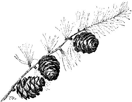 The Larch, which came from Switzerland, and the Cedar, which came from Lebanon in Palestine, both grow their seeds in cones, but they are rather different from the pines arrd firs. Their needle-leaves are very thin and grow in tufts eighteen or twenty together in the same sheath of scales. The cones of the cedar stand upright and are shaped like an egg, but the tree does not often bear cones in England. Larch cones are quite small, not more than an inch in length; they grow along the twigs in a row. The woody scales do not fit very tightly together.