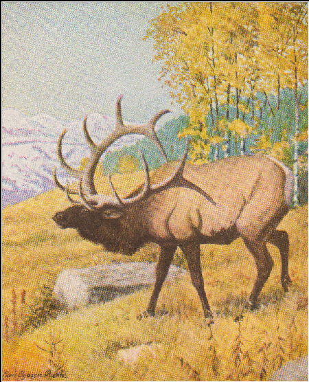 the mountains. "In the fall, when his antlers have hardened, Bugler moves down to join his family. The bigger and stronger he is, the bigger his family is, for he has a number of wives and they all live together in a herd or band of which Bugler is lord and master. He is ready and eager to fight for them, and terrible battles take place when another disputes his leadership. At this season he has a habit of stretching his neck out and emitting a far-reaching trumpet-like sound from which he gets the name of Bugler. It is a warning that he is ready to fight. "When the snows of winter come, many families get together and form great bands. Then they move down from the mountains in search of shelter and food. When a winter is very bad, many starve to death, for man has fenced in and made into farms much of the land where the elk once found ample food for winter.