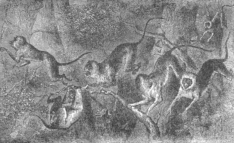 A Heard of MonkeysA heard of monkeys.—How they travel in the forest.—White-note monkeys.—Their great leaps.—How they keep food when not hungry. "HARK!" said I, "hark! What is the noise I hear? It must come from a band of monkeys traveling in the forest from tree to tree. It is no use to go to them," said I to Okabi; "let us hide ourselves in the direction where the noise comes from, and if they, come in a straight line they may pass over our heads, and we may then have a good shot at them." This was hardly said before it was done. We hid ourselves under a thick little bush. The noise came nearer and nearer. Ho! ho! I thought, they are going to pass just over our heads. This was a great piece of good fortune. I hid myself the best way I could, squatting close to the ground, and sinking my neck into my shoulders as much as possible, and hardly dared to breathe, when, by jingo, I felt like sneezing! It would have been nice work to sneeze just when the monkeys were close by, and to frighten them away, for the monkeys are shy here, being much hunted by the natives. Many and many hundreds of them have met their death by the arrows and traps of the skillful hunters. But here they come! I see the branches at the top of the trees moving. There must be at least fifteen or twenty monkeys, belonging to the white-nosed tribe, upon a journey. It was marvelous to see them seize the branches and swing themselves, in order to leap farther, just like a man on a trapeze. As they came down to the extremity of the light branches, these would bend several feet under their weight. They would leap to another branch, seize one, and then to an-other, never stopping to rest. Sometimes they would run a few steps on some long and stout branch, and leap again. In some places where the trees were not very near together in the direction in which they wished to travel, they would take flying leaps of fifteen to twenty feet, straight through the air, from branch to branch, without stopping to measure the distance. I was so deeply interested in watching their movements that I quite forgot that I had a gun, and that I was hungry. One by one they passed on, flying along like as if they had wings, or by magic, reaching the branch they aimed at with unerring certainty. Not one of them made a mistake; not one of them fell short of the branch he was after. In this manner monkeys journey for miles through the woods. Sometimes they make tremendous jumps from the upper boughs of high trees down to lower ones. I do not exaggerate at all when I say that sometimes I have surprised monkeys on high trees, and, after firing at them, I have seen them fall, apparently taking no heed, to a distance of thirty, forty, and perhaps fifty feet below, and disappear in the twinkling of an eye. Unless the monkeys shriek, there is no way to discover that they are about in the woods except by the noise occasioned by their tremendous leaps when on a journey, which sounds very strangely in the silence of these equatorial forests. On they go, leap after leap, for hours without resting. At other times, when they are only on a feeding excursion, and have reached a place where berries are abundant on the trees, they take it easy, and make their leaps slowly as they go along. It is by this noise chiefly that the hunters are guided when on the lookout for them. When there are many of them together they are difficult to approach, as they always have a sentinel on the watch, and at the least noise they decamp as fast as they can go; but when only two, three, or four of them are together, they are easier to approach, especially if they are hungry. The white-nosed monkey, the ndova, and the white-mustached monkey, the "miengai," are tremendous leapers in those forests. I doubt very much whether the nkago ("cercocebus") is quite as good a leaper as the two others. They attain all of them to a very large size in the wild state, and a good many must weigh more than thirty or forty-five pounds. The enormous canines the big ones possess show what they can do in the way of biting.