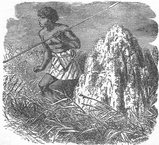 The height of the structure I examined was four feet and a half, and the diameter, at the broadest part, two feet and a half; after breaking one sinuosity, I found the cells to be about one inch and a half in length, and about half an inch in height, each cell corresponding with the others by corridors or round tunnels varying from half an inch to one inch in length, and about a quarter of an inch in diameter. In demolishing the sides, I found that the thickness of the wall was only one inch before the cells were found; but I found the earth at the top much harder than on the sides, as though the builders had put a much larger quantity of glutinous matter in this part of the structure. After breaking away three inches of this yellow top of the nest, I suddenly came to another layer half an inch thick, full of little holes or cells, so small that they had no doubt been built on purpose for the ants to remain there alone, but for what reason they required to remain alone I was unable to discover; at that time there were no ants there. Then with the axe I gave a powerful blow, and demolished another part of the structure, which disturbed the ants from their dark chambers. I saw there the three different classes of ants: the head men, very large, with whitish body and black head (these were but few in number); the workers, with short and thick body and broad head, but not so large as the chiefs; and, thirdly, the soldiers, not so large as the workers, more slender, and possessing longer nippers. These three distinct classes were the inhabitants of this curious structure. As I was looking at these ants, my attention was suddenly called to watch their movements. The soldiers came, and, ranging themselves round the broken cells, took their stand and remained immovable. Then the workers came; each carried between its pincers a small particle of yellow clay, which some of them collected from the broken pieces, and which stood in my sight, while others came with their loads from the cells; there were sometimes two or three busy together at the same time and in the same cells. Each ant came and put down its particle of wet clay with the utmost precision, and then with its head moved it right and left, and by so doing succeeded in making the bits stick together, and so finished the wall. Each bit was put by the side of the one left by the previous worker, who had gone to fetch more, for here I saw the same ant go and fetch fresh pieces of the same clay, which came from the structure I had broken. I observed that they never went outside the cells to get their materials. No masons could have worked more systematically. But how could the clay which I saw them take dry become suddenly wet? I took a small reed and advanced it quietly toward some; they made a spring at it (for these ants' bites are far worse than the others) and seized it with their nippers, and then threw upon it a little whitish, thickish matter, the same stuff that made the clay wet and ready for building purposes. During the working time not one of the largest class was in sight. The soldiers kept watch, and it was only just before the wall was closed that they retired. I give you, on the following page, a picture of the buildings of the termer bellicosus, which often reaches the height of twenty feet or more, so that you may see the great variety there is in the shape of the buildings made by the white ants in Africa, according to the different species. It will show you that there is as much diversity in the houses of the ants as there is among those of different races of men. The difference is no greater between a negro hut and a beautiful stone house, than between the shelter of the white ant living under the bark of trees, and the large structures of the more ingenious architects.
