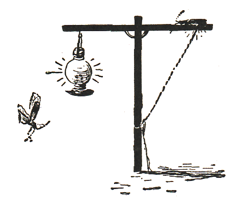 The fireflies are beetles, and there are many species which are luminous. A common one is here figured (Photinus pyralis).  It is pale gray above and the head is completely hidden by the big shield of the thorax. The legs are short; thus this beetle trusts mostly to its wings as a means of locomotion. The antennæ are rather long and are kept in constant motion, evidently conveying intelligence of surroundings to the insect. Beneath the gray elytra, or wing-covers, is a pair of large, dark-veined membranous wings which are folded in a very neat manner crosswise and lengthwise, when not in use. When in use, the wing-covers are lifted stiffly and the flying is done wholly with the membranous wings. Looked at from beneath, we can at once see that some of the segments of the abdomen are partly or entirely sulphur yellow, and we recognize them as the lamp. If the specimen is a male, the yellow area covers all of the end of the abdomen up to the fourth or fifth segment; but if it is a female, only the middle portion of the abdomen, especially the fifth segment, is converted into a lamp. These yellow areas, when dissected under the microscope, prove to be filled with fine tracheæ or air-tubes; and although we know very little about the way the light is made, it is believed that by flooding the tubes with air, the oxygen in some way produces the light.