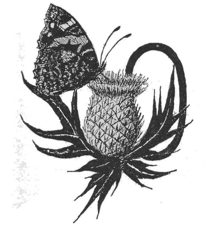 The stamens have dark purple anthers, united in a tube in which their pollen is discharged. The pistil, ripening later, shoves out the pollen with its stigma, which at first is blunt at the end, its two-parted lips so tightly held together that not a grain of its own flower's pollen can be taken. But when thrust far out beyond the anther-tube, the two-parted stigma opens to receive the pollen which is brought by the many winged visitors; for of all flowers, the thistles with their abundant nectar are the favorites of insects. Butterflies of many species, moths, beetles and bees—especially the bumblebees—are the happy guests of the thistle blooms. The thistles believe in large families; a single head of the lance-leaved thistle has been known to have 116 seeds. The seeds are oblong, pointed, little akenes, with hard shells. Very beautiful and wonderful is the pappus of the thistle; it is really the calyx of the flower, its tube being a narrow collar, and the lobes are split up into the silken floss. At the larger end of the seed is a circular depression with a tiny hub at its center; into this ring, and around the knob, is fitted the collar which attaches the down to the seed. Hold the balloon between the eye and the light, and it is easy to see that the down is made of many-branched plumes which interlace and make it more buoyant. When first taken from its crowded position on the flower-head, the pappus surrounds the corolla in a straight, close tube; but if placed for just a few moments in the sun, the threads spread, the filmy branchlets open out, and a fairy parachute is formed, with the seed hanging beneath; if no breath of air touches it while spreading, it will sometimes form a perfect funnel; when blown upon, some of the silken threads lose their places on the rim and rise to the center. When driven before the breeze, this balloon will float for a long distance. When it falls, it lets go of the seed as the wind moves it along the rough surface of the ground, and when it is thus unburdened the down fluffs out in every direction, making a perfect globe. For the first season after the seed has rooted, the thistle develops only rosettes, meanwhile putting down roots and becoming permanently established. The next season, the flowers and seeds are developed, and then the plant dies. Would that this fact were true of the Canada thistle; but that, unfortunately, is perennial, and its persistent roots can only be starved out by keeping the stalks cut to the ground for the entire season. This thistle trusts to its extensively creeping rootstocks more than to its seeds for retaining its foothold and for spreading. While it develops many seed balloons, a large number of its seeds are infertile and will not grow.