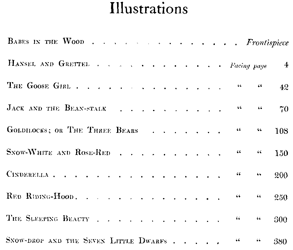 T HE primary idea of this collection of well-known and much-loved tales is to bring together under one cover those stories which have won a most assured place in literature for children between the ages of four and nine. The compiler has at different times had occasion to look up many of the tales contained in this collection, and quite frequently the task has been long and tedious. Many a librarian and teacher has sought his assistance, having failed, after exhausting all the means at her command, to locate some favorite story. To all in such case it is to be hoped that this volume will be of help. Stories for children should appeal especially to the imagination and its development, and the fairy or wonder tale is a most potent means to this end. That this has been recognized from the earliest times is proved by the fact that the original sources of many of the stories collected by Charles Perrault (published under the title of Mother Goose's Nursery Tales), the Brothers Grimm, Mme. D'Aulnoy, Charles Marelles, Asbjörnsen and Moe, Hans Christian Andersen, and others, are lost in the shades of antiquity. The fairy tales that have lived through the ages have done so because of their real merit. In most of them is evidenced the kindergarten idea of presenting something of real value, usually a stimulant to the moral sense, in a sugar-coated form. In any event, they are a source of unbounded delight to the child, and cruel indeed are the parents or guardians who, from a misguided sense of duty, deliberately exclude from the reading selected for the children committed to their care, everything that savors of "manifest untruth." It is to be regretted that there are many such unwise, not to say unkind, persons. It is perhaps worthy of note that Charles Perrault, the Countess d'Aulnoy, the Brothers Grimm, and others whose names are so closely associated with the fairy tale, are remembered solely on that account, and not by reason of any other contribution they may have made to the literature of their periods. Much attention is now given by educators to the study of fairy and folk tales, and their value to the child as a help towards his greater mental development. Heretofore this has been left to the parent, who, probably, has utilized this means merely to provide the child with amusement and pleasure, and without any idea of its educational possibilities. Who of us in relating to a child the exploits of "Jack and the Bean-Stalk," or "Tom Thumb " or "Jack the Giant Killer," is not carried back to the time when he sat himself in his mother's lap, listening with rapt attention to the unfolding of the story? One's own childhood days are brought back vividly, and, if for no other reason than this, let us be grateful for the fairy tale. In this volume a wide range of authorities has been consulted, and every effort made to give the best version of each tale.