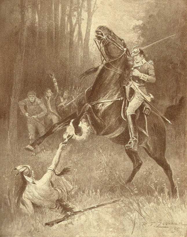 We now come to the last Indian fight of the war. A short time before the British forces evacuated Savannah, General Anthony Wayne, who commanded the American force in its vicinity, was surprised in his camp by the Creek chieftain, Guristersigo. This warrior, intending to join the British with his followers, had marched through Georgia unobserved, and fell upon the rear of Wayne's camp at three o'clock in the morning. Wayne was not expecting an attack, especially from Indians, but his men, as usual, slept on their arms that night and were ready for action. Guristersigo intended to strike Wayne's picket-guard, stationed at a little distance from the main body; as the two had that day exchanged places, he ignorantly attacked the stronger instead of the weaker party. The onset was furious; but, aroused by the Indian warwhoop, the infantry quickly seized their arms, and the artillerymen hastened to their guns. Two of the pieces were captured; but while the Indians were endeavoring to turn them upon the Americans, the latter had time to rally. Colonel Posey led his infantry to the charge, while Wayne headed the cavalry, who cut down the naked warriors with their broadswords, and, turning their flank, quickly put them to flight.