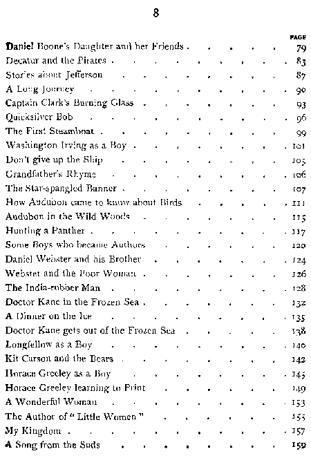 PrefaceThe primary aim of this book is to furnish the little learner reading matter that will excite his attention and give him pleasure, and thus make lighter the difficult task of learning to read. The ruggedness of this task has often been increased by the use of disconnected sentences, or lessons as dry and uninteresting as finger exercises on the piano. It is a sign of promise that the demand for reading matter of interest to the child has come from teachers. I have endeavored to meet this requirement in the following stories. As far as possible the words chosen have been such as are not difficult to the little reader, either from their length or their unfamiliarity. The sentences and paragraphs are short. Learning to read is like climbing a steep hill, and it is a great relief to the panting child to find frequent breathing places. It is one of the purposes of these stories to make the mind of the pupil familiar with some of the leading figures in the history of our country by means of personal anecdote. Some of the stories are those that every American child ought to know, because they have become a kind of national folklore. Such, for example, are "Putnam and the Wolf" and the story of "Franklin's Whistle." I have thought it important to present as great a variety of subjects as possible, so that the pupil may learn something not only of great warriors and patriots, but also of great statesmen. The exploits of discoverers, the triumphs of American inventors, and the achievements of men of letters and men of science, find place in these stories. All the narratives are historical, or at least no stories have been told for true that are deemed fictitious. Every means which the writer's literary experience could suggest has been used to make the stories engaging, in the hope that the interest of the narrative may prove a sufficient spur to exertion on the part of the pupil, and that this little book will make green and pleasant a pathway that has so often been dry and laborious. It will surely serve to excite an early interest in our national history by giving some of the great personages of that history a place among the heroes that impress the susceptible imagination of a child. It is thus that biographical and historical incidents acquire something of the vitality of folk tales. The illustrations that accompany the text have been planned with special reference to the awakening of the child's attention. To keep the mind alert and at its best is more than half the battle in teaching. The publishers and the author of this little book believe that in laying the foundation of a child's education the best work is none too good. The larger words have been divided by hyphens when a separation into syllables is likely to help the learner. The use of the hyphen has been regulated entirely with a view to its utility. After a word not too difficult has been made familiar by its repeated occurrence, the hyphens are omitted.