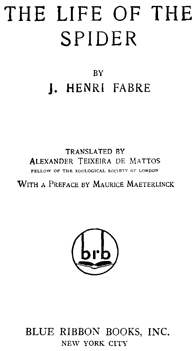 T HE following essays have been selected from the ten volumes composing the Souvenirs entomologiques. Although a good deal of Henri Fabre's masterpiece has been published in English, none of the articles treating of spiders has been issued before, with the exception of that forming Chapter II of the present volume, The Banded Epeira, which first appeared in The English Review. The rest are new to England and America. The Fabre books already published are Insect Life, translated by the author of Mademoiselle Mori (Macmillan Co., 1901) ; The Life and Love of the Insect, translated by myself (Macmillan Co., 1911) ; and Social Life in the Insect World, translated by Mr. Bernard Miall (Century Co., 1912). References to the above volumes will be found, whenever necessary, in the footnotes to the present edition. For the rest, I have tried not to overburden my version with notes; and, in view of this, I have, as far as possible, simplified the scientific terms that occur in the text. In so doing I know that I have but followed the wishes of the author, who never wearies of protesting against `the barbarous terminology' favoured by his brother-naturalists. The matter became even more urgent in English than in any of the Latin languages; and I readily agreed when it was pointed out to me that, in a work essentially intended for general reading, there was no purpose, in speaking of a Coleopteron when the word `beetle' was to hand. In cases where an insect had inevitably to be mentioned by its Greek or Latin name, a note is given explaining, in the fewest words, the nature of the insect in question. I have to thank my friend, M. Maurice Nlaeterlinck, for the stately preface which he has contributed to this volume, and Mr. Marmaduke Langdale and Miss Frances Rodwell for the generous assistance which they have given me in the details of my work. And I am also greatly indebted to Mr. W. S. Graff Baker for his invaluable help with the mathematical difficulties that confronted me in the translation of the Appendix.