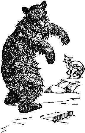 Why the Bear Has a Short TailONE cold morning when the fox was coming up the road with some fish, he met the bear. "Good-morning, Mr. Fox," said the bear. "Good-morning, Mr. Bear," said the fox. "The morning is brighter because I have met you." "Those are very good fish, Mr. Fox," said the bear. "I have not eaten such fish for many a day. Where do you find them?" "I have been fishing, Mr. Bear," answered the fox. "If I could catch such fish as those, I should like to go fishing, but I do not know how to fish." "It would be very easy for you to learn, Mr. Bear," said the fox. "You are so big and strong that you can do anything." "Will you teach me, Mr. Fox?" asked the bear. "I would not tell everybody, but you are such a good friend that I will teach you. Come to this pond, and I will show you how to fish through the ice." So the fox and the bear went to the frozen pond, and the fox showed the bear how to make a hole in the ice. "That is easy for you," said the fox, "but many an animal could not have made that hole. Now comes the secret. You must put your tail down into the water and keep it there. That is not easy, and not every animal could do it, for the water is very cold; but you are a learned animal, Mr. Bear, and you know that the secret of catching fish is to keep your tail in the water a long time. Then when you pull it up, you will pull with it as many fish as I have." The bear put his tail down into the water, and the fox went away. The sun rose high in the heavens, and still the bear sat with his tail through the hole in the ice. Sunset came, but still the bear sat with his tail through the hole in the ice, for he thought, "When an animal is really learned, he will not fear a little cold." It began to be dark, and the bear said, "Now I will pull the fish out of the water. How good they will be!" He pulled and pulled, but not a fish came out. Worse than that, not all of his tail came out, for the end of it was frozen fast to the ice.