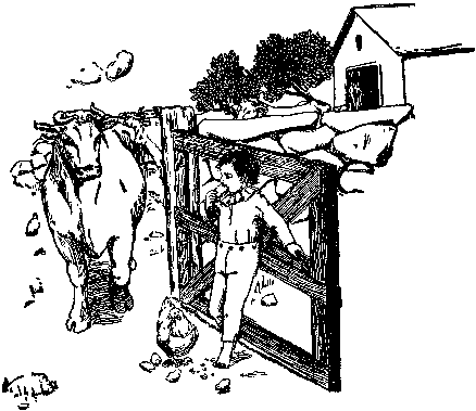 with his bare feet, for in the When the cows were all in the field, they began to eat the grass; and they walked slowly about, eating the grass, until they had had all they wanted. Then they went over to the corner of the field, where there was a stream of water running along, and each cow took a drink of water. In the middle of the field was a big tree with long branches and a great many leaves, so that under the tree it was shady and cool. By the time the cows had eaten all the grass they wanted, it was hot out in the sun, and they all walked over to the big tree and got in the cool shade. Some of them lay down and some of them stood still, and they switched their tails about to keep the flies off, and they chewed their cuds. For a cow has two kinds of stomach. When she bites off the grass, she swallows it down quickly, and it goes into the first stomach; and after awhile, when she has eaten all the grass she wants, she goes and lies down, or stands still and some of the grass comes back into her mouth in a bunch and she chews it all up fine and swallows it again, so that it goes down into her real stomach. Then another bunch comes up and she chews that and swallows it, and so she does until all the grass is chewed up fine. That is what they call chewing the cud. So the cows stayed in the shade of the big tree until they were hungry again, and then they walked about and ate some more of the grass and drank some more water out of the little stream. And by that time it was in the afternoon and almost time for little John to come to drive them home.