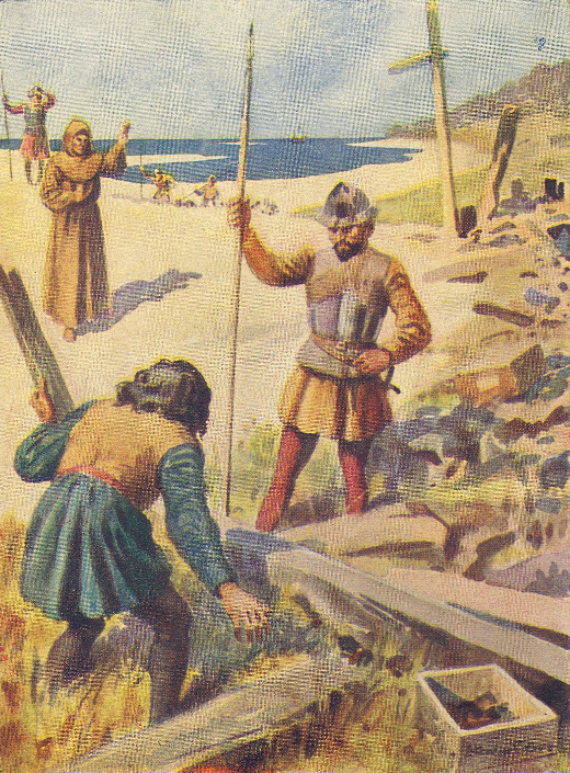 The Fate of the First ColonistsThere was no difficulty in getting ships together for a second voyage. Three large vessels, attended by fourteen smaller, such as Columbus had used before, lay waiting for him in Cadiz Bay. From all sides men pressed to take part in the expedition; sailors, craftsmen, and miners, who would be useful in the new colony; monks, who were to bring the Indians to the Christian faith; and men of noble birth, who would be the companions of the Admiral, take charge of exploring parties, and, if necessary, captain the Spaniards against attacks from the natives. All were on fire with desire of glory, of riches, of adventure. As Columbus moved about the ships his appearance was hailed with joy. Every one watched for the great leader whose courage and genius were to bring him fortune and fame. Never was there a gladder band of adventurers. On board were stored not only provisions, but spades and ploughs, grain and vine-slips, seeds of oranges, lemons, and other fruit, and calves, goats, sheep, and fowls for the colony. There were also eight pigs, which multiplied so quickly that the islands were soon full of them, and about twenty horses for the Spanish cavalry. Diego Columbus went with his brother, and Bartholomew wrote to say that he would follow them out. Henceforward the Admiral in all his voyages was to be surrounded by faithful kinsmen. One thing only troubled him. Juan de Fonseca, who had been appointed by the Spanish sovereigns to find supplies and look after the welfare of the colonists, proved to be a man of irritable temper, jealous of Columbus, and disposed to do him an ill turn. He feared that, while he was in a foreign land, one powerful enemy in Spain might do much harm. So indeed it proved. The ships touched at the Canary Islands, and then sailed steadily across the Atlantic. Columbus steered to the south of his old course, as he hoped to make new discoveries before reaching Navidad. On Sunday the 3rd of November 1493, seven weeks after they had set out, a pilot cried: "The reward! Land! I see land!" and directly afterwards six green islands were visible. These were some of the group called the Lesser Antilles, and the ships passed from one to another in search of a good harbour. At length the Spaniards landed at the large island of Guadaloupe, and pressed inland till they came to a village. The huts were well built and airy, but they were horrified to find in all men's bones and skulls, and traces of the cooking of human flesh. The natives had fled to the woods. However, some women were found who told Columbus that they had been made prisoners and carried off from their homes by the terrible cannibal Caribs, who inhabited this and all the smaller islands. These Caribs came in canoes, and burned the villages of the gentler Indians, killed the men and took away their bodies for food, and kept the women prisoners, for women's flesh made them sick. The Spaniards, disgusted by this story, went back to the ships. On the way they gathered pine-apples for the first time, and declared this was the best fruit men had ever eaten. That evening they missed a captain and eight sailors, and were much alarmed lest the Caribs should have seized them. The island was too large to search, but the Admiral gave orders that guns should be fired and trumpets sounded to recall the stragglers, who still did not appear. His fears were somewhat relieved by hearing from an Indian woman that most of the Carib men were away with their king in canoes, and that those who remained had only tortoiseshell arrows, and were no match for the Spaniards. After a day or two had passed, and no news had come, Ojeda, a brave young noble, offered to lead an expedition in search of the lost party. But though he climbed up rocky hills and through almost impassable gorges, he saw no traces of them. At last, on the fourth day, after all hope had been given up, the wanderers arrived, dirty and exhausted. They said they had met no savages, but had strayed through forests where the trees were so tall and thick that they could not see the sun in the daytime nor the stars by night. They would have died if they had not by chance come to the sea and followed it round the island to the ships. Columbus punished the men severely for lingering behind, and then set sail without having seen the war-bands of Guadaloupe. Later, however, he did fight with the Caribs. A boat's crew came upon a canoe filled with men and women of a yellowish colour, long-haired, and with their ankles and wrists so tightly bound by cotton bandages that their legs and arms were dreadfully swollen. At first they were startled by the approach of the white men, and sat still; then, as they drew nearer, they turned on them fiercely, instead of running away as the other Indians did, and shot some of the Spaniards with poisoned arrows. They were made prisoners and put in chains, but even then they glared at their captors with such threatening looks that they were terrible to approach. No gentleness and no bribes could soften either the men or the women, and Columbus, who naturally was horrified by their cannibal habits, soon gave up his attempts. Fearing that the colonists might be getting short of provisions, he determined not to delay longer among these islands, but to sail to the north-west for Hayti. He reached the eastern point and passed slowly along the north coast, looking out for signs of his old crew. Before reaching Navidad he had to cross the mouth of the Golden River, a great stream which flowed from the very heart of the island. There some of his men who had gone ashore made a horrible discovery. Four corpses bound with grass-ropes were lying in the sun. One had a beard, and they knew him to be a Spaniard, for all the Indians had smooth chins. A great fear fell upon the expedition, and they moved on in dread of some shameful disaster. At night they reached Navidad, and found all quiet and dark. Guns were fired, but there was no ans