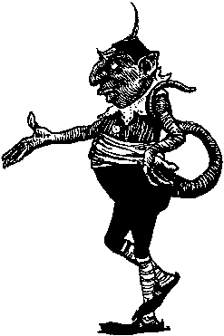 Well, when the girl heard this, she felt as if she could have jumped out of her skin for joy, but she didn't say a word. Next day that there little thing looked so maliceful when he came for the flax. And when night came she heard that knocking against the window panes. She oped the window, and that come right in on the ledge. That was grinning from ear to ear, and Oo! that's tail was twirling round so fast. "What's my name?" that says, as that gave her the skeins. "Is that Solomon?" she says, pretending to be afeard. "Noo, t'ain't," that says, and that came further into the room. "Well, is that Zebedee?" says she again. "Noo, t'ain't," says the impet. And then that laughed and twirled that's tail till you couldn't hardly see it. "Take time, woman," that says; "next guess, and you're mine." And that stretched out that's black hands at her. Well, she backed a step or two, and she looked at it, and then she laughed out, and says she, pointing her finger at it: