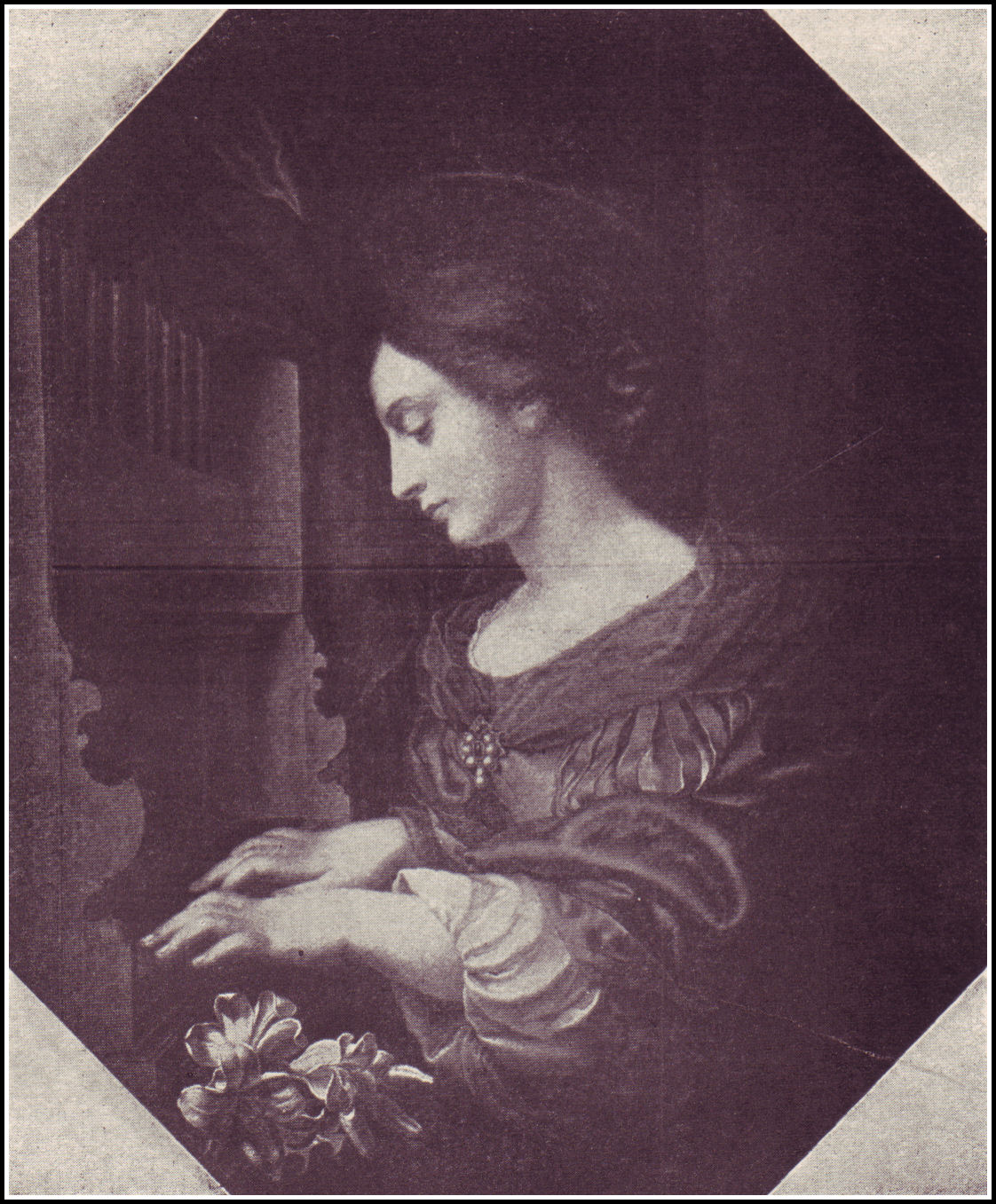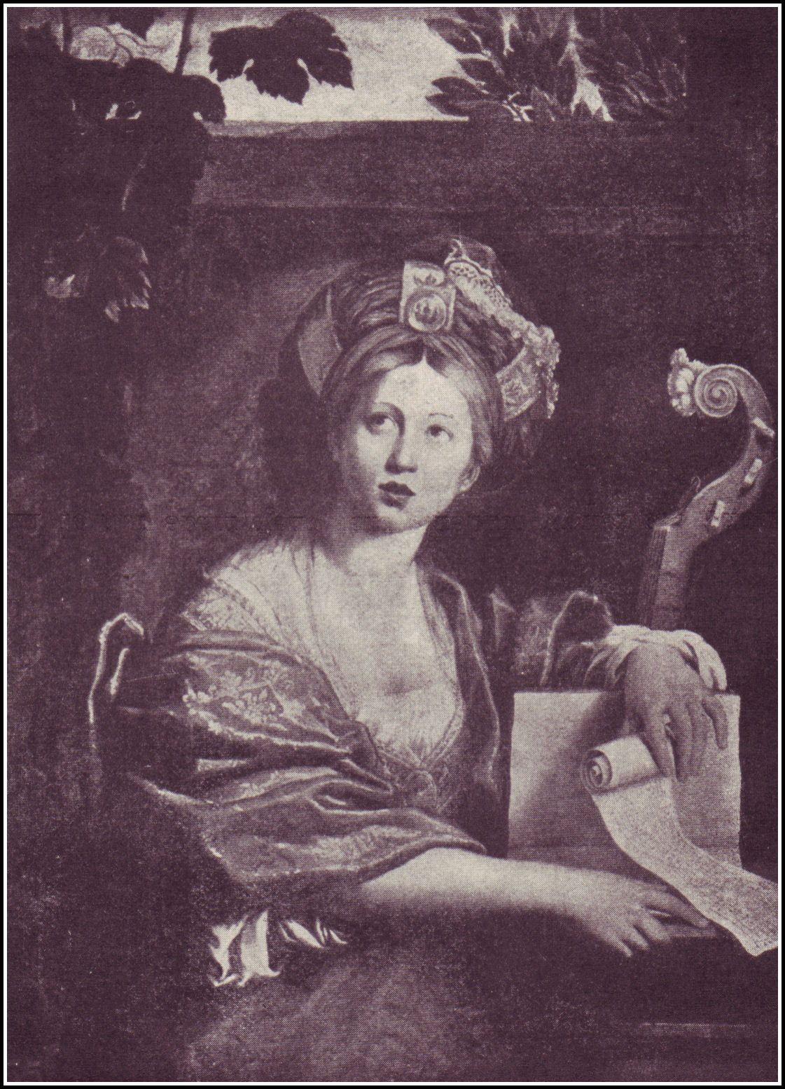 To Guercino, another master of the Bolognese Eclectic school, at least three great pictures must be attributed. His "Aurora," although it lacks the grand unity of Guido Reni's treatment of the same subject, merits a large place among the beautiful pictures of the world. There are the same fine horses that we see in Guido's picture and the chariot, but the Apollo is like a woman, and the Hours, instead of circling about the sun's car in rhythmic tread, are few in number and separated from him who gives them being and to the wheels of whose chariot it is their privilege to be chained. The flowers, that in Guido's will fall to redden the sunrise sky, are in Guercino's flung about in mid heaven and the poetry of the thought is lost. The same artist has given us a "St. Cecilia." She is richly clad, with eyes uplifted, as if to see the angel choir whose music is present in her ears. Most gracefully she draws a bow across the strings of a bass viol, while her delicate fingers stray along the strings above. There is something almost humorous in the zeal with which the little angel holds up the music book in spite of the abstracted air of the enraptured saint. Altogether she is an admirable creation and lovely enough to stand beside Raphael's picture of the same subject. At about the same time that this "St. Cecilia" was given to the world in Florence, a quiet, softly smiling artist, with pencil dipped in rainbow colors, was giving us another "St. Cecilia" even more popular than Guercino's. Everyone knows Carlo Dolci's picture of this subject. That exquisite head bent in contemplation of the music that her own fingers call forth from the organ, the instrument of her invention, is almost as familiar to us as the picture of mother or sister. What is the charm of that head? Perhaps we cannot tell but we know we would not change it—the stray lock upon the forehead, the downcast eyes, the gauzy drapery about her shoulders or the jewel that quivers on her saintly breast. Though weakness usually marks this artist's work his "St. Cecilia" will never grow less to us. It is an ideal head, not to be given up by the world.