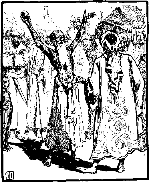 The next morning, after Schaibar had been informed of the affair, he and Prince Ahmed set out for the Sultan's Court. When they arrived at the gates of the capital the people no sooner saw Schaibar but they ran and hid themselves; and some shut up their shops and locked themselves up in their houses, while others, flying communicated their fear to all they met, who stayed not to look behind them, but ran too; insomuch that Schaibar and Prince Ahmed, as they went along, found the streets all desolate till they came to the palaces, where the porters, instead of keeping the gates, ran away too, so that the Prince and Schaibar advanced without any obstacle to the council-hall, where the Sultan was seated on his throne, and giving audience. Here likewise the ushers, at the approach of Schaibar, abandoned their posts, and gave them free admittance. Schaibar went boldly and fiercely up to the throne, without waiting to be presented by Prince Ahmed, and accosted the Sultan of the Indies in these words: "Thou hast asked for me," said he; "see, here I am: what wouldst thou have with me?" The Sultan, instead of answering him, clapped his hands before his eyes, to avoid the sight of so terrible an object; at which uncivil and rude reception Schaibar was so much provoked, after he had given him the trouble to come so far, that he instantly lifted up his iron bar and killed him, before Prince Ahmed could intercede in his behalf. All that he could do was to prevent his killing the grand vizier, who sat not far from him, representing to him that he had always given the Sultan his father good advice. "These are they, then," said Schaibar, "who gave him bad," and as he pronounced these words he killed all the other viziers and flattering favourites of the Sultan who were Prince Ahmed's enemies. Every time he struck he killed some one or other, and none escaped but they who were not so frightened as to stand staring and gaping, and who saved themselves by flight.