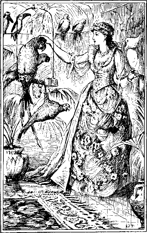 "He said I could make him happy," said Beauty to herself. "It seems, then, that this horrible Beast keeps him a prisoner. How can I set him free? I wonder why they both told me not to trust to appearances? I don't understand it. But, after all, it was only a dream, so why should I trouble myself about it? I had better go and find something to do to amuse myself." So she got up and began to explore some of the many rooms of the palace. The first she entered was lined with mirrors, and Beauty saw herself reflected on every side, and thought she had never seen such a charming room. Then a bracelet which was hanging from a chandelier caught her eye, and on taking it down she was greatly surprised to find that it held a portrait of her unknown admirer, just as she had seen him in her dream. With great delight she slipped the bracelet on her arm, and went on into a gallery of pictures, where she soon found a portrait of the same handsome Prince, as large as life, and so well painted that as she studied it he seemed to smile kindly at her. Tearing herself away from the portrait at last, she passed through into a room which contained every musical instrument under the sun, and here she amused herself for a long while in trying some of them, and singing until she was tired. The next room was a library, and she saw everything she had ever wanted to read, as well as everything she had read, and it seemed to her that a whole lifetime would not be enough to even read the names of the books, there were so many. By this time it was growing dusk, and wax candles in diamond and ruby candlesticks were beginning to light themselves in every room. Beauty found her supper served just at the time she preferred to have it, but she did not see anyone or hear a sound, and, though her father had warned her that she would be alone, she began to find it rather dull. But presently she heard the Beast coming, and wondered tremblingly if he meant to eat her up now. However, as he did not seem at all ferocious, and only said gruffly: "Good-evening, Beauty," she answered cheerfully and managed to conceal her terror. Then the Beast asked her how she had been amusing herself, and she told him all the rooms she had seen. Then he asked if she thought she could be happy in his palace; and Beauty answered that everything was so beautiful that she would be very hard to please if she could not be happy. And after about an hour's talk Beauty began to think that the Beast was not nearly so terrible as she had supposed at first. Then he got up to leave her, and said in his gruff voice: "Do you love me, Beauty? Will you marry me?" "Oh! what shall I say?" cried Beauty, for she was afraid to make the Beast angry by refusing. "Say 'yes' or 'no' without fear," he replied. "Oh! no, Beast," said Beauty hastily. "Since you will not, good-night, Beauty," he said. And she answered: "Good-night, Beast," very glad to find that her refusal had not provoked him. And after he was gone she was very soon in bed and asleep, and dreaming of her unknown Prince. She thought he came and said to her: "Ah, Beauty! why are you so unkind to me? I fear I am fated to be unhappy for many a long day still." And then her dreams changed, but the charming Prince figured in them all; and when morning came her first thought was to look at the portrait, and see if it was really like him, and she found that it certainly was. This morning she decided to amuse herself in the garden, for the sun shone, and all the fountains were playing; but she was astonished to find that every place was familiar to her, and presently she came to the brook where the myrtle trees were growing where she had first met the Prince in her dream, and that made her think more than ever that he must be kept a prisoner by the Beast. When she was tired she went back to the palace, and found a new room full of materials for every kind of work—ribbons to make into bows, and silks to work into flowers. Then there was an aviary full of rare birds, which were so tame that they flew to Beauty as soon as they saw her, and perched upon her shoulders and her head. "Pretty little creatures," she said, "how I wish that your cage was nearer to my room, that I might often hear you sing!" So saying she opened a door, and found to her delight that it led into her own room, though she had thought it was quite the other side of the palace.