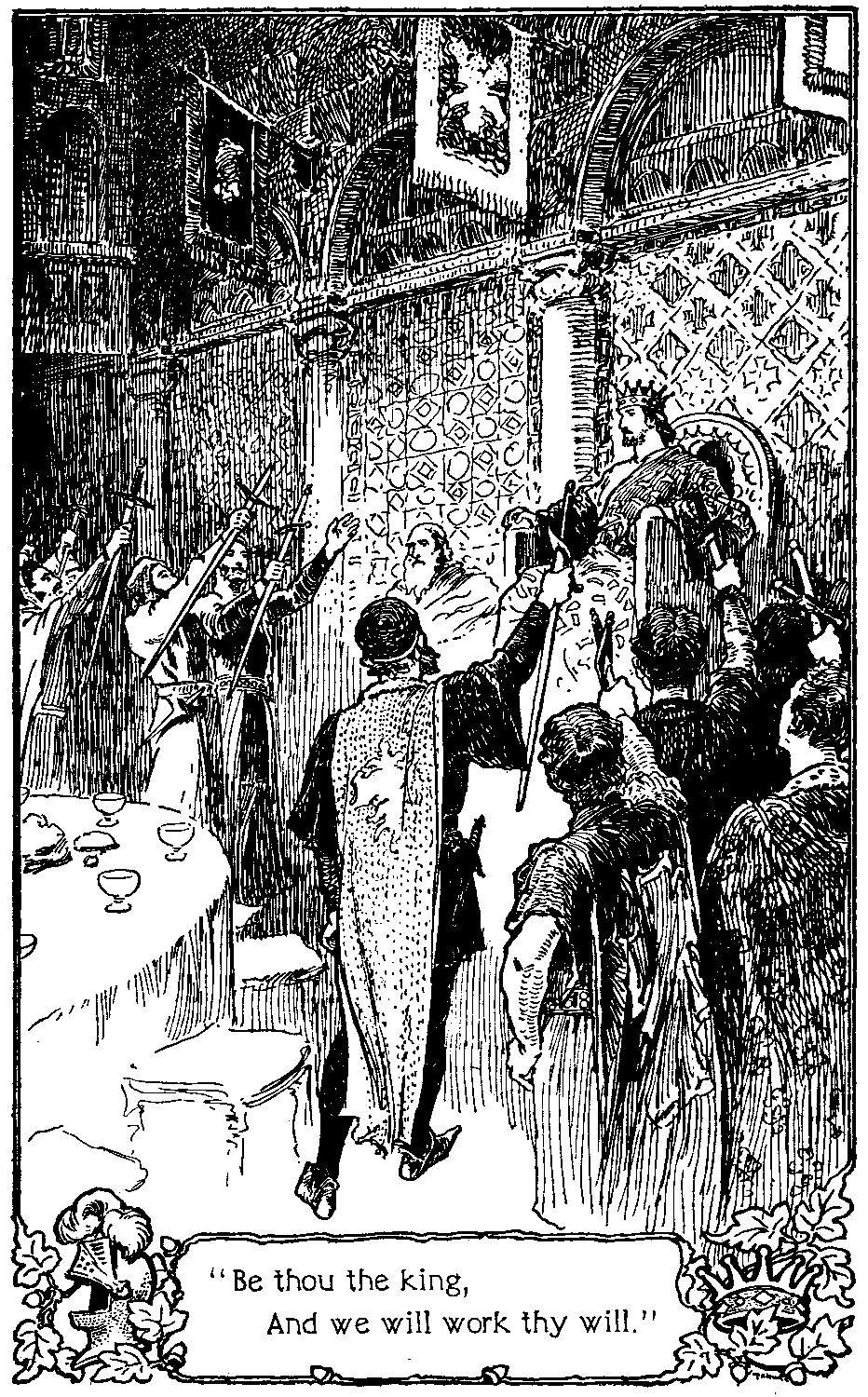 So strait were the vows by which he bound them, that when they rose after kneeling and repeating the words after him, some of the knights were pale as death, others flushed, and others stood half-dazed as though a vision had been granted them, so deeply were they moved. And when they turned to find their seats again, behold on every seat was written in letters of gold the name of him who should sit therein. Ere they separated the king spoke to them of their land and all they might do for it. With wise and cheerful words he set before them his thoughts and plans, and they responded gladly. And the archbishop blessed them as they parted, saying in solemn tones,