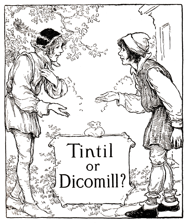 Or perhaps he would answer, "You must find it yourself," and that was what every child longed to do. Whenever Tintil came up or down the road, with his little flute in his hand, and his cap, with a gay feather in it, on the side of his head, and a red leaf or yellow cowslip pinned on his coat, there was always a crowd to meet him, and it was, "Tintil, tell us a tale," from the time he came till the time he went. Nobody knew where he lived. He was here to-day and gone to-morrow. And nobody knew whether Tintil were his real name or not, but it made no difference. It was a pleasant name to say, and suited him exactly. He was a rover, but Dicomill was a stay-at-home. Dicomill lived in the house where he was born, which was the mill, and though he liked well to hear of other people's travels, and learned more of them than you would think, he had never been farther than the next market town. He worked in the mill, and was often covered from his head to his toes with the dust of corn and the dust of wheat. It was easy to tell where he got his name. At first, it is true, he had been called "Dick of the Mill," but this had soon been shortened to Dicomill, which suited him exactly and was just as pleasant to say as Tintil. On fine evenings when the wheat and the corn had been ground and the mill was quiet, Dicomill would sit in the doorway of his home and tell stories to any one who cared to listen. There was always a crowd of children, and grown people, too, around him. Dicomill's stories had nothing magic in them. They might have happened anywhere in the Border Land, and sometimes his listeners thought that he was telling of people whom they knew. But if they said this to him, he would only shake his head and laugh. He was no great talker, anyway, outside his tale-telling. Now, one evening just as Dicomill had finished a story and the children were begging for another, Tintil came down the road playing a gay little tune on his flute and stepping along as if he were leading a May dance. Dicomill was the first to see him. "Now you shall hear a tale worth two of mine," he said to the children, and he called to Tintil, asking him to stop and give them the news from the Wood that was called Enchanted. Tintil was willing enough to stop in such good company, but before he could begin a story some one in the crowd at the mill door had a great thought and spoke it out. "Why should not Tintil and Dicomill have a contest of tales?" he said. "Then we can decide once for all which is the better story-teller, a question that nobody can answer now." Everybody was well pleased with this plan, especially the children, and the mayor of the town, who had come to smoke a pipe with Dicomill's father, the old miller, put his head out of the door to say that he would give six shillings to the one who was judged the winner of the contest. "And every listener shall have a vote," said he. But though Tintil and Dicomill told story for story till their tongues were tired, the question could not be decided. If one listener voted for Tintil, another was sure to choose Dicomill, and so it went till the mayor gave three shillings to each of the story-tellers and won himself the name of being a very wise mayor indeed. There were only two who were not satisfied with the settlement, and these two were no other than Tintil and Dicomill themselves. "I know good tales when I hear them," said Tintil, "and I vote for Dicomill." "My tales are as plain as a mill-sack," said Dicomill, "but Tintil's tales are woven of rainbow stuff, and the prize should be his." It is even said that they bought gifts for each other with the mayor's shillings. That is as it may be, and was long ago, but when you have read their stories from beginning to end you may still vote for Tintil or Dicomill. All that you need do is to make your choice between them, and tell it to everybody you can find who has read the book, too. That is a merry ball to set a-rolling! Or, if you like, you may cast your vote in this way: Draw a circle for Tintil or a square for Dicomill on a bit of paper and give it to the wind. Yes, the wind is the only postman you can trust in such an important matter. He will take your vote somewhere, you may be sure of that. But whether you choose Tintil or Dicomill, here is a rhyme that is your very own, for it was made for you: