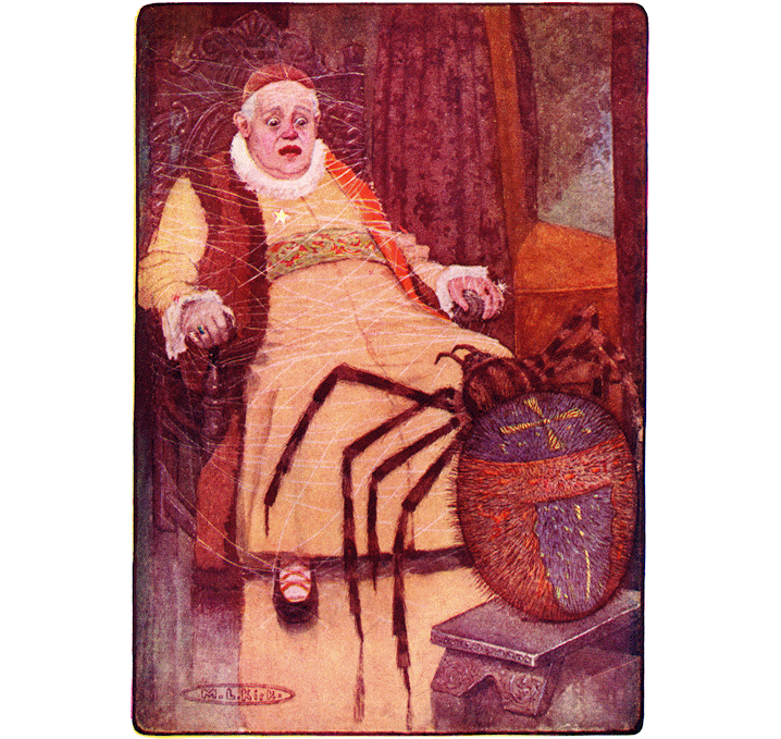 A S soon as they were gone, Curdie brought the creatures back to the servants' hall, and told them to eat up everything on the table. It was a sight to see them all standing round it—except such as had to get upon it—eating and drinking, each after its fashion, without a smile, or a word, or a glance of fellowship in the act. A very few moments served to make everything eatable vanish, and then Curdie requested them to clean the house, and the page who stood by to assist them. Every one set about it except Ballbody: he could do nothing at cleaning, for the more he rolled, the more he spread the dirt. Curdie was curious to know what he had been, and how he had come to be such as he was: but he could only conjecture that he was a gluttonous alderman whom nature had treated homœopathically. And now there was such a cleaning and clearing out of neglected places, such a burying and burning of refuse, such a rinsing of jugs, such a swilling of sinks, and such a flushing of drains, as would have delighted the eyes of all true housekeepers and lovers of cleanliness generally. Curdie meantime was with the king, telling him all he had done. They had heard a little noise, but not much, for he had told the avengers to repress outcry as much as possible; and they had seen to it that the more any one cried out the more he had to cry out upon, while the patient ones they scarcely hurt at all. Having promised his majesty and her royal highness a good breakfast, Curdie now went to finish the business. The courtiers must be dealt with. A few who were the worst, and the leaders of the rest, must be made examples of; the others should be driven from their beds to the street. He found the chiefs of the conspiracy holding a final consultation in the smaller room off the hall. These were the lord chamberlain, the attorney-general, the master of the horse, and the king's private secretary: the lord chancellor and the rest, as foolish as faithless, were but the tools of these. The housemaid had shown him a little closet, opening from a passage behind, where he could overhear all that passed in that room; and now Curdie heard enough to understand that they had determined, in the dead of that night, rather in the deepest dark before the morning, to bring a certain company of soldiers into the palace, make away with the king, secure the princess, announce the sudden death of his majesty, read as his the will they had drawn up, and proceed to govern the country at their ease, and with results: they would at once levy severer taxes, and pick a quarrel with the most powerful of their neighbours. Everything settled, they agreed to retire, and have a few hours' quiet sleep first—all but the secretary, who was to sit up and call them at the proper moment. Curdie stole away, allowed them half an hour to get to bed, and then set about completing his purgation of the palace. First he called Lina, and opened the door of the room where the secretary sat. She crept in, and laid herself down against it. When the secretary, rising to stretch his legs, caught sight of her eyes, he stood frozen with terror. She made neither motion nor sound. Gathering courage, and taking the thing for a spectral illusion, he made a step forward. She showed her other teeth, with a growl neither more than audible nor less than horrible. The secretary sank fainting into a chair. He was not a brave man, and besides, his conscience had gone over to the enemy, and was sitting against the door by Lina. To the lord chamberlain's door next, Curdie conducted the legserpent, and let him in. Now his lordship had had a bedstead made for himself, sweetly fashioned of rods of silver gilt: upon it the legserpent found him asleep, and under it he crept. But out he came on the other side, and crept over it next, and again under it, and so over it, under it, over it, five or six times, every time leaving a coil of himself behind him, until he had softly folded all his length about the lord chamberlain and his bed. This done, he set up his head, looking down with curved neck right over his lordship's, and began to hiss in his face. He woke in terror unspeakable, and would have started up; but the moment he moved, the legserpent drew his coils closer, and closer still, and drew and drew until the quaking traitor heard the joints of his bedstead grinding and gnarring. Presently he persuaded himself that it was only a horrid nightmare, and began to struggle with all his strength to throw it off. Thereupon the legserpent gave his hooked nose such a bite that his teeth met through it—but it was hardly thicker than the bowl of a spoon; and then the vulture knew that he was in the grasp of his enemy the snake, and yielded. As soon as he was quiet the legserpent began to untwist and retwist, to uncoil and recoil himself, swinging and swaying, knotting and relaxing himself with strangest curves and convolutions, always however, leaving at least one coil around his victim. At last he undid himself entirely, and crept from the bed. Then first the lord chamberlain discovered that his tormentor had bent and twisted the bedstead, legs and canopy and all, so about him, that he was shut in a silver cage out of which it was impossible for him to find a way. Once more, thinking his enemy was gone, he began to shout for help. But the instant he opened his mouth his keeper darted at him and bit him, and after three or four such essays, with like result, he lay still. The master of the horse Curdie gave in charge to the tapir. When the soldier saw him enter—for he was not yet asleep—he sprang from his bed, and flew at him with his sword. But the creature's hide was invulnerable to his blows, and he pecked at his legs with his proboscis until he jumped into bed again, groaning, and covered himself up; after which the tapir contented himself with now and then paying a visit to his toes. As for the attorney-general, Curdie led to his door a huge spider, about two feet long in t