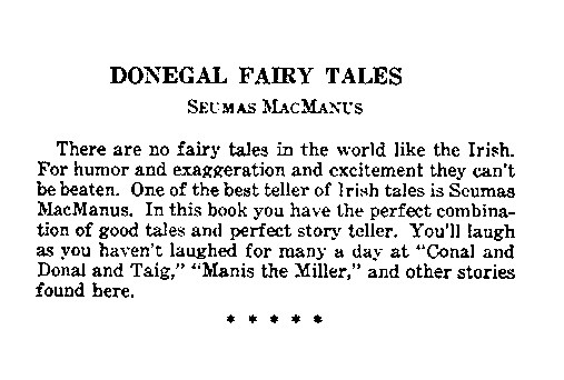 Our TalesTales as old as the curlew's call are to-day listened to around the hearths of Donegal with the same keen and credulous eagerness with which they were hearkened to hundreds of years ago. Of a people whose only wealth is mental and spiritual, the thousand such tales are not the least significant heritage. Of those tales, the ten following are but the lightest. The man who brings his shaggy pony to the forge "reharses a rale oul' tale" for the boys, whilst he lazily works the bellows for Dan. As she spins in the glow of the fir-blaze on the long winter nights, the old white-capped woman, with hair like a streak of lint, holds the fireside circle spellbound with such tales as these. When at Taig, the tailor's, on a Saturday night, an exasperated man clamors angrily for the long-promised coat, Taig says, "Arrah, Conal, man, have sense, and be quate, and sit down till ye hear a wondherful story of anshint happenin's." And the magic of the tale restores Conal to a Christian frame of mind, and sends him home forgetful of a great procrastinator's deceit. When the beggarman, coming in at dayli' gone, drops his staff and sheds his bags in token that he deigns to honor the good people with his presence for that night, among young and old there is anticipative joy for the grand stories with which he will certainly enchant them till (too soon) an bhean-an-tighe shakes her beads and says it is rosary-time. The professional shanachy recites them to a charmed audience in the wake-house, in the potato field, on the green hillside on summer Sundays, and at the cross-roads in blissful autumn gloamings, whilst the green marge rests his hearers' aching limbs. Like generations of his people, one particular barefoot boy, being himself enchanted with them, longed to transmit their charm to others, and spent many, many delightful hours acquiring fresh ones, and recounting old ones to groups the most sceptical of whom more than half believed, like himself, in their literal truth. To a wider world and more cultured, he would fain tell them now. He would wish that this world might hear of the wonderful happenings with our ears, and see them with our eyes, and consent to experience for a few hours the charmed delight with which our simple, kindly people, at the feet of their own shanachies, hearken to them. He would wish that this world might, for a few hours, give him their credence on trust, consent to forget temporarily that life is hard and joyless, be foolish, simple children once more, and bring to the entertainment the fresh and fun-loving hearts they possessed ere the world's wisdom came to them. And if they return to the world's wise ways with a lurking delight in their hearts, the shanachy will again feel rejoiced and proud for the triumph of our grand old tales.
