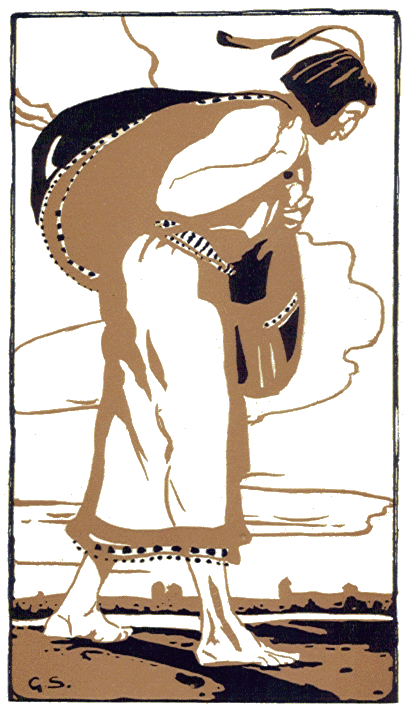 One morning at dawn of day he rose and went to find food for breakfast. He left his little boys asleep under the trees. He walked through the forest until he came suddenly upon a wide and open red plain. There was not a tree or a rock or a blade of grass upon it. He set out across the plain, and when he reached the middle of it, he met a small man with a red feather in his cap. "Where are you going?" said the little man. "I am going across the plain to the woods on the other side," said the man; "my boys are hungry without food, and I am looking for game." "How strong are you?" said the little man. "I am as strong as the human race," said the man, "but no stronger." "My name is Red Plume," said the little man; "we must wrestle. If you should make me fall, say to me 'I have thrown you'; if you should overcome me you will never want for food, for you will have other nourishment than fish and game." They smoked their pipes for a long while, and then they wrestled. They wrestled for a long time. The warrior was growing weak, for the little man was very strong. But at last he threw Red Plume down and cried, "I have thrown you." And at once the little man disappeared. When the warrior looked on the ground where his opponent had fallen, he saw only a crooked thing like an acorn, with a red tassel on it. He picked it up and looked at it, and as he looked, a voice from it said, "Take off my outside covering; split me into many parts, and throw the parts over the plain; scatter every bit of me; throw my spine near the woods. Then in a month come back to the plain." The warrior did as he was told, and then went back to his boys. On the way he killed a rabbit and cooked it for breakfast. He did not tell his boys what he had seen.