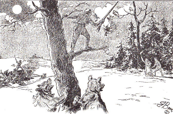 Mr. Brent saw the boy starting down the hill toward the wagon and motioned to him to go back. Balser quickly perceived that it would be worse than madness to go to his father. The wolves would at once turn their attack upon him, and his father would be compelled to abandon his advantageous position in the wagon and go to his relief, in which case both father and son would be lost. Should Balser fire into the pack of wolves from where he stood, he would bring upon himself and his father the same disaster. He felt his helplessness grievously, but his quick wit came to his assistance. He looked about him for a tree which he could climb, and soon found one. At first he hesitated to make use of the tree, for it was dead and apparently rotten; but there was none other at hand, so he hastily climbed up and seated himself firmly upon a limb which seemed strong enough to sustain his weight. Balser was now safe from the wolves, and at a distance of not more than twenty yards from his father. There he waited until the clouds for a moment permitted the full light of the moon to rest upon the scene, and then he took deliberate aim and fired into the pack of howling wolves. A sharp yelp answered his shot, and then a black, seething mass of growling, fighting, snapping beasts fell upon the carcass of the wolf that Balser's shot had killed, and almost instantly they devoured their unfortunate companion. Balser felt that if he could kill enough wolves to satisfy the hunger of the living ones they would abandon their attack upon his father, for wolves, like cowardly men, are brave only in desperation. They will attack neither man nor animal except when driven to do so by hunger. After Balser had killed the wolf, clouds obscured the moon before he could make another shot. He feared to fire in the dark lest he might kill his father, so he waited impatiently for the light which did not come. Meanwhile, the dead wolf having been devoured, the pack again turned upon Mr. Brent, and Balser could hear his father's voice and the clanking of the iron upon the singletree as he struck at the wolves to ward them off. It seemed to Balser that the moon had gone under the clouds never to appear again. Mr. Brent continually called loudly to the wolves, for the human voice is an awesome sound even to the fiercest animals. To Balser the tone of his father's voice, mingled with the howling of wolves, was a note of desperation that almost drove him frantic. The wind increased in fury every moment, and Balser felt the cold piercing to the marrow of his bones. He had waited it seemed to him hours for the light of the moon again to shine, but the clouds appeared to grow deeper and the darkness more dense. While Balser was vainly endeavouring to watch the conflict at the wagon, he heard a noise at the root of the tree in which he had taken refuge, and, looking down, he discovered a black monster standing quietly beneath him. It was a bear that had been attracted to the scene of battle by the noise. Balser at once thought, "Could I kill this huge bear, his great carcass certainly would satisfy the hunger of the wolves that surround my father." Accordingly he lowered the point of his gun, and, taking as good aim as the darkness would permit, he fired upon the bear. The bear gave forth a frightful growl of rage and pain, and as it did so its companion, a beast of enormous size, came running up, apparently for the purpose of rendering assistance. Balser hastily reloaded his gun and prepared to shoot the other bear. This he soon did, and while the wolves howled about his father the two wounded bears at the foot of the tree made night hideous with their ravings. Such a frightful bedlam of noises had never before been heard. Balser was again loading his gun, hoping to finish the bears, when he saw two lighted torches approaching along the path over which he had just come, and as they came into view imagine his consternation when he recognized the forms of Liney Fox and her brother Tom. Tom carried his father's gun, for Mr. Fox had gone to Brookville, and Liney, in addition to her torch, carried Tom's hatchet. Liney and Tom were approaching rapidly, and Balser called out to them to stop. They did not hear him, or did not heed him, but continued to go forward to their death. The bears at the foot of the tree were wounded, and would be more dangerous than even the pack of wolves howling at the wagon.