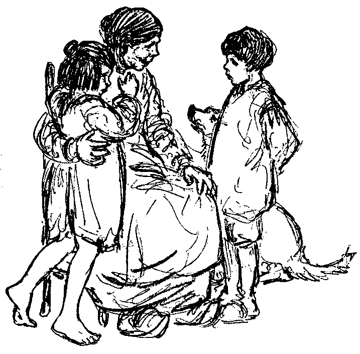 Jan and Marie were still looking with all their eyes across the still water toward the sunset and trying to see the crystal palace of the eels, when suddenly from behind them there came a loud "Hee-haw, hee-haw." They jumped, and Granny jumped, too, and they all looked around to see where the sound came from. There, coming slowly toward them along the tow-path on the river-bank, was an old brown mule. She was pulling a low, green river-boat by a towline, and a small boy, not much bigger than Jan, was driving her. On the deck of the boat there was a little cabin with white curtains in the tiny windows and two red geraniums in pots standing on the sills. From a clothesline hitched to the rigging there fluttered a row of little shirts, and seated on a box near by there was a fat, friendly looking woman with two small children playing by her side. The father of the family was busy with the tiller. "There come the De Smets, as sure as you live!" cried Granny, rising from the wheelbarrow, where she had been sitting. "I certainly am glad to see them." And she started at once down the river to meet the boat, with Jan and Marie and Fidel all following. "Ship ahoy!" she cried gayly as the boat drew near. The boy who was driving the mule grinned shyly. The woman on deck lifted her eyes from her sewing, smiled, and waved her hand at Granny, while the two little children ran to the edge of the boat; and held out their arms to her. "Here we are again, war or no war!" cried Mother De Smet, as the boat came alongside. Father De Smet left the tiller and threw a rope ashore. "Whoa!" cried the boy driving the mule. The mule stopped with the greatest willingness, the boy caught the rope and lifted the great loop over a strong post on the river-bank, and the "Old Woman"—for that was the name of the boat—was in port. Soon a gangplank was slipped from the boat to the little wooden steps on the bank, and Mother De Smet, with a squirming baby under each arm, came ashore. "I do like to get out on dry land and shake my legs a bit now and then," she said cheerfully as she greeted Granny. "On the boat I just sit still and grow fat!"