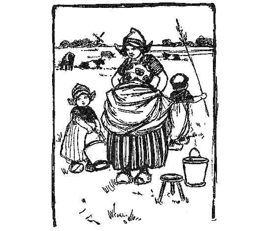 "Y ESTERDAY was a very long day," said Vrouw Vedder on the morning after Market Day. "You were gone such a long time." Kat gave her mother a great hug. "We'll stay with you all day today, Mother," she said. "Won't we, Kit?" "Yes," said Kit; and he hugged her too. "And we'll help you just as much as we helped Father yesterday. Won't we, Kit?" "More," said Kit. "I shouldn't wonder!" said Father. "I shall be glad of help," said Vrouw Vedder, "because Grandma is coming, and I want everything to be very clean and tidy when she comes. I'm going first to the pasture to milk the cow. You can go with me and keep the flies away. That will be a great help." Vrouw Vedder put a yoke across her shoulders, with hooks hanging from each end of it. Then she hung a large pail on one of the hooks, and a brass milk can on the other. She gave Kat a little pail to carry, and Kit took some switches from the willow tree in the yard, with which to drive away the flies. Then they all three started down the road to the pasture.
