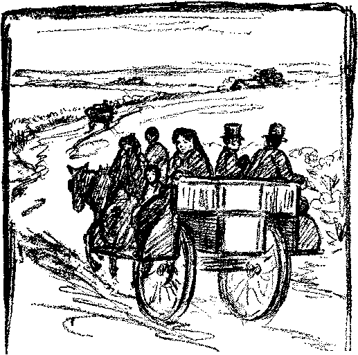 Mr. McQueen and the Twins stood still with their bundles in their hands until she had finished and risen from her knees, then they went quietly out the door, all four together, and closed it after them. Mrs. McQueen stooped to gather a little bunch of shamrock leaves which grew by the doorstone, and then the McQueen family was quite, quite ready for the long journey. Mr. Maguire had bought Colleen and the cows, and he was to have the few hens that were left for taking the McQueen family to the train. Larry and Eileen saw him coming up the road. "Here comes Mr. Maguire with the cart!" they cried, "and Dennis is driving the jaunting-car with Michael and Grannie on it." They soon reached the little group by the roadside, and then the luggage was loaded into the cart. Mrs. McQueen got up with Grannie on one side of the jaunting-car and Eileen sat between them. Michael and Mr. McQueen were on the other side with Larry. The small bags and bundles were put in the well of the jaunting-car. "Get up!" cried Dennis, and off they started. Mrs. McQueen looked back at the old house, and cried into her new shawl. Grannie was crying, too. But Michael said, "Wait until you see your new home, and sure, you 'll be crying to think you were n't in it before!" And that cheered them up again, and soon a turn in the road hid the old house from their sight forever.