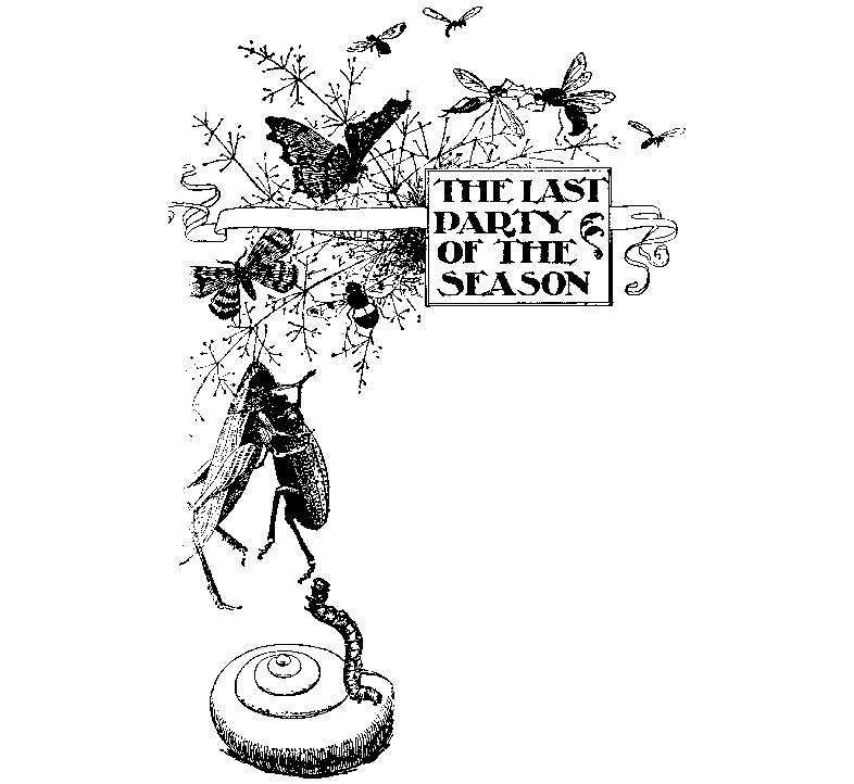 The Snail and the fat, old Cricket had meant to look on, and really did so, for a time, from a warm corner by the tree, but the Cricket couldn't stand it to not join in the fun. First, his eyes gleamed, his feelers waved, and his feet kept time to the music, and, when a frisky young Ant beckoned to him, he gave a great leap and danced with the rest, balancing, jumping, and circling around in a most surprising way. When it grew dark, the Fireflies' lights shone like tiny stars, and the dancing went on until all were tired and ready to sing together the last song of the summer, for on the morrow they would go to rest. And this was their song: