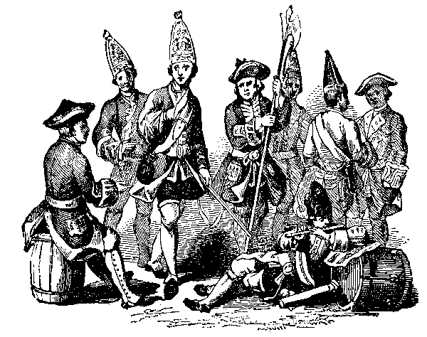 Washington and His ArmyNow that the war had really begun, events followed upon each other thick and fast. Before the summer was over, every colony, from New Hampshire to Georgia, was up in arms. Washington had gathered his army outside of Boston, and there he held General Gage imprisoned in the city. Washington had now several good generals to help him, one of whom, called "Old Put," was famed far and wide for his pluck. In another chapter you will read about Old Put's wolf hunt—a story you must know; for although it is not exactly a story of the Revolution, still it does no harm to know any story of the heroes of the Revolution that tells of the daring courage of these men. But we were speaking of Washington's army. In a "History of Our Country," written by Abby Sage Richardson, is the following excellent description of the appearance of the Colonial army. "You can form no idea what a task lay before Washington and his generals. Here was a great body of men hurried into the field from farms and workshops, with no more idea of military drill than a herd of sheep, with miserable old muskets, scanty supply of powder and balls, and no money to buy any. Then the dress of this provincial army was enough to excite the laugh which the British soldiers raised at them. Some of them were dressed in the long-tailed linsey-woolsey coats, and linsey-woolsey breeches, which had been spun and woven in farm-house kitchens; some wore smock frocks like a butcher, also made of homespun; some wore suits of British broadcloth, so long used for Sunday clothes that they had grown rather the worse for wear; and every variety of dress and fashion figured in these motley ranks. "When General Washington rode grandly out on horseback, dressed in his fine blue broadcloth coat, with buff colored facings, buff waistcoat and breeches, a hat with black cockade, and a sword in an elegantly embroidered sword-belt, I think his heart must have sunk within him as he looked on his tatterdemalion army, and then glanced over towards Boston, and thought of the British soldiers, gorgeous in their elegant new uniforms, trained to march up to the cannon's mouth like a solid wall in motion."
