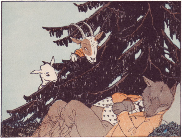 And so she helped him out, and heard how the wolf had come, and eaten all the rest. And you may think how she cried for the loss of her dear children. At last in her grief she wandered out of doors, and the youngest kid with her; and when they came into the meadow, there they saw the wolf lying under a tree, and snoring so that the branches shook. The mother goat looked at him carefully on all sides and she noticed how something inside his body was moving and struggling.