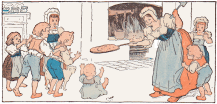 "Oh, give me a bit of pancake, mother, dear, I am so hungry," said one child. "Oh, darling mother," said the second. "Oh, darling, good mother," said the third. "Oh, darling, good, sweet mother," said the fourth. "Oh, darling, pretty, good, sweet mother," said the fifth. "Oh, darling, pretty, good, sweet, clever mother," said the sixth. "Oh, darling, pretty, good, sweet, clever, kindest little mother," said the seventh. So they begged for the pancake all around, the one more prettily than the other, for they were so hungry and so good. "Yes, yes, children, only bide a bit till it turns itself"—she ought to have said, 'till I can get it turned,'—"and then you shall have some lovely sweet milk pancake. Only look how fat and happy it lies there." When the pancake heard all this it became afraid, and in a trice it turned itself and tried to jump out of the pan, but it fell back into it again, the other side up. When it had been fried a little on the other side too, till it got firm and stiff, it jumped out of the pan to the floor and rolled off like a wheel through the door and down the hill. "Holloa! Stop, pancake!" and away ran the mother after it, with the frying pan in one hand and the ladle in the other, as fast as she could, and all the children behind her, while the old father on crutches limped after them last of all.