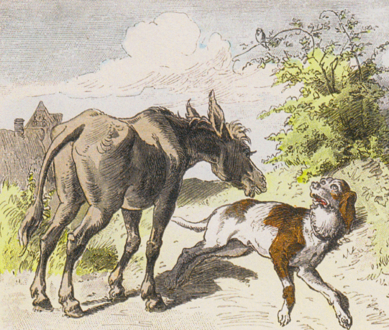 As he ran through the yard, past the dunghill, the donkey gave him a good kick with his hind-foot.