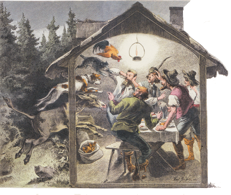 When that was done, at a signal they began their music all together: the donkey brayed, the dog barked, the cat mewed, and the cock crowed; then, with one great smash, they dashed through the window into the room, so that the glass clattered down. The robbers jumped up at this dreadful noise, thinking that nothing less than a ghost was coming in, and ran away into the wood in a great fright. The four companions then sat down at the table, quite content with what was left there, and ate as if they were expecting to fast for a month to come.