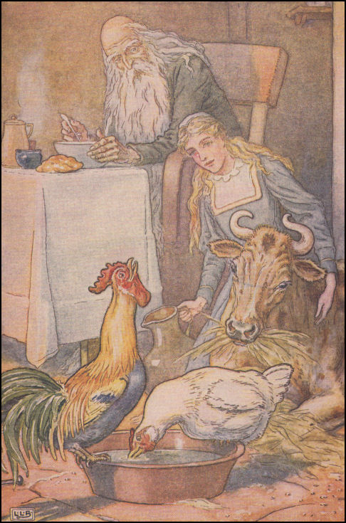 "Just come in," cried the voice, and when she opened the door, an old gray-haired man was sitting at the table, supporting his face with both hands, and his white beard fell down over the table almost as far as the ground. By the stove lay three animals, a hen, a cock, and a brindled cow. The girl told her story to the old man, and begged for shelter for the night. The man said,