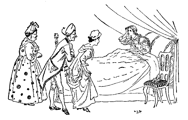 Then the maiden went upstairs, shook the feather-beds, and laid clean sheets on them, and when she had done it the old man came and lay down on one of the beds, and his white beard reached down to his feet. The girl lay down on the other, said her prayers, and fell asleep. She slept quietly till midnight, and then there was such a noise in the house that she awoke. There was a sound of cracking and splitting in every corner, and the doors sprang open, and beat against the walls. The beams groaned as if they were being torn out of their joints, it seemed as if the staircase were falling down, and at length there was a crash as if the entire roof had fallen in. As, however, all grew quiet once more, and the girl was not hurt, she stayed quietly lying where she was, and fell asleep again. But when she woke up in the morning with the brilliancy of the sunshine, what did her eyes behold? She was lying in a vast hall, and everything around her shone with royal splendor; on the walls, golden flowers grew up on a ground of green silk, the bed was of ivory, and the canopy of red velvet, and on a chair close by, was a pair of shoes embroidered with pearls. The girl believed that she was in a dream, but three richly clad attendants came in, and asked what orders she would like to give?