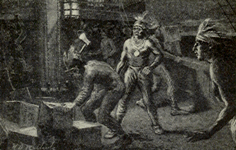 In the glimmer of dim candlelight in the dark of the old church, it was voted unanimously not to land the tea. "How will tea mix with salt water?" someone called out, and there was great applause. Samuel Adams adjourned the meeting. What would happen? The answer came on the instant—the war whoop of Indians. Nathaniel shivered, for that sound awakened memories. Then he saw fifty Indians in full war dress pass quickly by the church and down the street, and with the others he followed to the wharf and in the cold, clear moonlight saw a strange sight. The Indians quietly boarded the three ships, cut open the tea chests one after the other, and threw every bit of tea overboard. Scarcely a leaf of tea escaped them. But nothing else was harmed and no one was molested. By nine o'clock all the tea was well brewed with salt water. Swiftly, silently and in order everything had been done. "Was ever anything like it?" people said. But Nathaniel was seeing the great dark forest again, the wolf, the swift river, and the silent Indian boy. "It's a way they have," he said. "Do it, and be done with it." As he stood on the street corner, the Indians swept by, and one of them, strangely familiar beneath his feathers and paint, turned suddenly and whispered, "What if the Indians once again should steal you? I am minded to have them." "No, need, sir," Nathaniel spoke impetuously. "I'm with you already." He had no idea he was going to say it, but, once said, he knew it was true. Once again a band of Indians had swept him from his place, this time not on to a silent river of the North but on to the great stream of patriotism which was flooding the country. "Bravo, lad," his Indian called back. "I knew you'd come to it. It's the only way for an honest craftsman." And Nathaniel went off feeling strangely free and light-hearted.