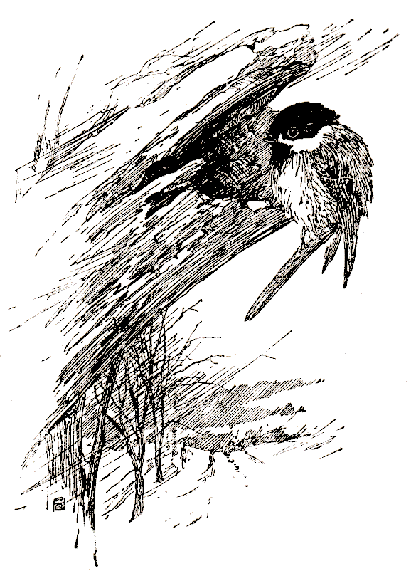 I WAS crunching along through the January dusk toward home. The cold was bitter. A half-starved partridge had just risen from the road and fluttered off among the naked bushes—a bit of life vanishing into the winter night of the woods. I knew the very hemlock in which he would roost; but what were the thick, snow-bent boughs of his hemlock, and what were all his winter feathers in such a night as this?—this night of cutting winds and frozen snow! The road dipped from the woods down into a wide, open meadow, where the winds were free. The cold was driving, numbing here, with a power for death that the thermometer could not mark. I backed against the gale and sidewise hastened forward toward the double line of elms that arched the road in front of the house. Already I could hear them creak and rattle like things of glass. It was not the sound of life. Nothing was alive; for what could live in this long darkness and fearful cold? The question was hardly thought, when an answer was whirled past me into the nearest of the naked elms. A chickadee! He caught for an instant on a dead stub of a limb that stuck out over the road, scrambled along to its broken tip, and whisked into a hole that ran straight down the centre of the old stub, down, for I don't know how far.