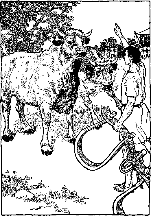 The Golden FleeceThe Argo was headed for Colchis, where the Golden Fleece was kept in a sacred grove. The first danger her crew had to meet was at the opening of the Euxine or Black Sea, where two islands floated about, sometimes knocking against each other and crushing everything caught between them. When these clashing rocks were reached the sailors let go a dove they had on their ship. She flew between the islands and only lost one or two tail-feathers. Jason seized the favorable moment of the rebound. The crew rowed hard and pulled the ship through with very little damage. At Colchis the king said they could have the Golden Fleece, but there were two or three little things that must be done first. He had two bulls whose feet were brass and whose breath were fire. Would Jason kindly yoke them to a plow? Then there were the teeth of that dragon which Cadmus had killed. If they were sown, armed men would be the harvest. Would Jason like to do a little farming of that kind? Jason said that he had no objection. He would do anything necessary to get the Fleece. A day was fixed for these trials, and Jason went away from the palace. In the garden he met the king's daughter, Medea. She was young and handsome, but she was a powerful witch. She liked the young stranger and promised to help him. She taught him some magic words to say and gave him a charm that would conquer everything. On the day of the trial the king had a throne set up in the field, and crowds were standing around. The keeper of the bulls let them go, and they came rushing into the open space where Jason stood. When they drew near he spoke the magic words. The bulls stopped short. They did not paw the ground, and their breath was not quite so fiery. Jason walked up to them, spoke kindly to them, patted their sides, and slipped a yoke over their necks. He led them quietly to the plow, hitched them up, and plowed the field.