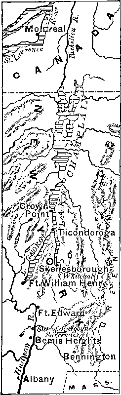 thus completely separating The English had good reason to expect this plan to succeed. Not only was New York City already in their hands, but Canada was theirs as well. They were in a position to invade New York State from the north, south, or west; and they concluded to attack from all three directions. One army under General Burgoyne was to enter New York State from Canada, by way of Lake Champlain. General Howe, with a second army, was to move up the Hudson from New York City. Colonel St. Leger, with still another army, was to land at Oswego and, conquering as he came, march through the Mohawk Valley. With their work done, all three armies were to meet at Albany. The summer of 1777 saw this plan set in motion, and down from the North came General Burgoyne with a force of nearly eight thousand soldiers and Indians.