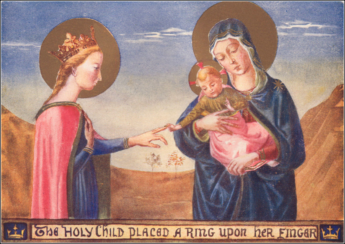 Saint Catherine of SienaAs the years pass by Father Time makes many changes in the busy town and quiet country, but there are some places he seems to have forgotten or passed over so lightly that they look very much the same to-day as they did hundreds of years ago. One of these places, which Time has dealt so gently with, is in the heart of Italy, built high upon a hill. It is a town whose towers and palaces and steep, narrow streets are little changed from what they were five hundred and more years ago, when Catherine, the saint of Siena, was born there. To-day if you climb the steep winding road that leads up to the city, and make your way through the gates and along the steepest of the narrow streets, you will come to a house with a motto written over the door in golden letters—"Sposæ Christi Katharinæ domus," which means "The house of Katherine, the bride of Christ." And if you go in you will see the very room where Saint Catherine used to live, the bed of planks on which she slept, her little chapel, and the rooms which her brothers and sisters used. It all looks just as it did when Benincasa, the dyer of Siena, lived there with his wife Lapa. They had more than twenty children, but each one was welcome, and when at last Catherine and a twin sister were born, there still did not seem one too many. The little sister lived only a few days, and perhaps that made the parents love Catherine all the more, and it was not only her own family who loved her. She was the favourite of all the neighbours, and however busy they were they would always find time to stop and talk to her as they passed. It was not that she was very beautiful, or even very clever, but she had a way of making every one feel happy when she was near them, and she had the sunniest smile that ever dimpled a baby's face. It was like a sunbeam, lighting up everything near it, and it shone in her eyes as well, so that ere long the people found a new name for her, and called her "Joy" instead of Catherine. As soon as she could walk alone, Catherine would wander away, sure of a welcome at every house, and though at first when the other children cried, "The baby is lost again!" the mother would be anxious, she soon ceased to mind, and only said, "She is sure to be safe somewhere." And safe she always was, for every one would stop work to look after her as she toddled along, and wherever she went Joy carried the sunshine with her. It happened that one afternoon when Catherine was about six years old, her mother sent her and an elder brother, Stephen, to carry a message to a house some way off. It was a beautiful evening, and as the children went hand in hand down the steep street and up the hill towards the great church of Saint Dominic, Catherine stopped a moment to look at the sunset. She always loved beautiful colours, and to-night the little fleecy clouds were all touched with crimson and gold, like fairy islands in a pale green sea, more beautiful than anything she had ever seen. Stephen did not care for sunsets. He was much more anxious to be home in time for supper, so he ran on alone, calling to Catherine to follow quickly. Catherine did not seem to hear his voice or to notice that he was gone, but stood there with eyes fixed on the sunset, her face shining, and her hair like a halo of gold round her head. It was not the evening sky she was looking at, but a vision of heavenly beauty. For there among the rose-pink clouds she saw the Madonna seated upon a throne and holding in her arms the infant Christ. It was no longer the poor Madonna of the stable, but the Queen of Heaven, her dazzling robe blue as the summer sky, and a jewelled crown upon her head. Only the same sweet mother-look was there as when she bent over the manger-bed. There are no words to tell of the beauty of the Christ-child's face. Catherine only knew that as He looked at her He smiled and held up His little hand as if in blessing, and that smile drew her heart to His feet. Then suddenly Catherine's arm was roughly shaken and her brother asked her impatiently at what she was gazing. "O Stephen," she cried, "did you not see it too? Look!" But the vision had faded, and the grey twilight closed in upon the two little figures as they went slowly home, the boy vexed with his loitering sister, and she sobbing with disappointment to think that the window in heaven was shut, and that she might never again look within. As Catherine grew older, she never forgot the vision she had seen, or how the hand of the Christ-child had been stretched out to bless her. And it made her think often how she could best please Him, so that some day He might smile on her again. Catherine had heard a great deal about the good men who went to live in deserts to be alone with God,—how they lived in caves and had scarcely anything to eat, and how God would sometimes send the ravens to bring them food. Now she was always fond of wandering, and the idea of living in a desert seemed a beautiful way of serving Christ. She had never gone beyond the walls of the town, and all outside was a new world to her; so she was sure if only she could pass through the city gates, she would soon find her way to the desert, where there would certainly be a cave ready for her to live in. So one day Catherine set out very early in the morning, carrying in her pocket a small loaf of bread, just in case the ravens should forget to come to a little girl-hermit. In those days it was not safe to live outside the city walls, and there were no farms nor houses to be seen as Catherine slipped through the gates and began to find her way down the hillside, among tangled briars and over rough stones. Soon her feet grew very tired, and everything looked so forlorn and wild that she was sure this must be the desert at last, and there, too, was a little cave in the rocks waiting all ready for her. It was very nice to creep in and out of the hot sunshine into the cool shade, and to rest until the sun went down. But
