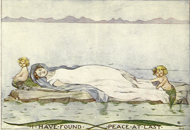 But that sleep was not the sleep of death. In the middle of the night she awoke and looked up to see the kindly stars shining down on her and to feel the cool wind gently stirring her hair. The soothing sound of the lapping water was still the only thing she heard, and again a great peace seemed to wrap her round and comfort her sad heart. Then, as she lay there watching the stars, a light began to dawn in the sky. At first she thought it must be morning, but it was not at all like the light of dawn. Brighter and brighter it grew until it took the form of a shining cloud, so white and full of dazzling light that it seemed as if the midday sun must be shining from within. Flavia gazed with wondering eyes as the cloud came ever nearer and nearer until it hung over the rock on which she lay. Then the wonder of it seemed to grow too great for mortal eyes. Like the petals of a white flower the soft masses of cloud unfolded from within, and there in the centre of the light stood the Madonna. Flavia knew that face at once, although it was far more beautiful than any picture she had ever seen. The pitying look in the Madonna's face grew deeper as she bent down over Flavia and gently spoke to her. "Poor child," she said, "I have come to put an end to all thy sufferings. There is nothing now but happiness in store for thee. Ere long thou wilt be taken from off this rock and thy troubles will be over. But first I have a gift to bestow upon thee." And as she spoke the Madonna fastened two of the fairest, whitest hands upon Flavia's poor wrists, and round the join she placed two bands of shining gold. They looked the most perfect, the most beautiful hands that mortal eyes had ever seen, and no wonder, since they were a gift from the Madonna herself. "O Madonna mia," said Flavia with a sobbing breath, "take me away with thee. I am so weary of this world and all its troubles. I only want to be at rest." "Nay," said the Madonna, "I cannot take thee with me now, for there is still work for thee to do on earth." "How can that be?" asked Flavia sadly. "Only wait and thou shalt see," answered the Madonna. "I have still another gift for thee. When I am gone lift up that stone close to the water's edge, and under it thou shalt find a bunch of sweet herbs. Take them with thee, for they will cure all ills and bring much comfort to those in sorrow. Now, my child, wait patiently for thy release, and farewell." Then the cloud began to fold itself once more like a closing flower round its shining heart. And Flavia watched it float away, growing dimmer and dimmer in the distance, until it vanished from her sight. Could it have been only a dream and was she still asleep? Flavia wondered if she was dreaming, but she looked down at those fair white hands and the golden bands and knew that the Madonna had indeed come to comfort and heal her. Then she remembered the second gift, and, lifting the stone, she found there the bunch of sweet herbs which the Madonna had promised. She pressed them against her cheek to smell their fragrance and then carefully hid them in her robe. And, strange to say, she felt almost as happy and light-hearted as she used to feel when she was a young bride and Empress of Rome. It was morning now, and as she looked across the blue water she saw a fishing-boat coming towards the island rowed by two men, one old and bent and the other with a bandage round his eyes. She called to them as they were rowing past, but at first they did not hear. Presently, however, they caught sight of her and came towards the rock. The amazement of the fishermen was great to see a lady on that desolate island. It was all the more strange because she was so beautiful, with such wonderful golden bracelets and fair, white hands. They thought it must be some vision, until Flavia spoke to them and asked them from whence they came. They told her their home was in a little fishing-village some distance from Ostia, and this pleased Flavia well. "Wilt thou take me there?" she asked the old man. "I will find means to repay thee." The old man spoke some words to his companion, who nodded his head. He was a young man and seemed to be suffering great pain when he lifted the bandage from his eyes and tried to look at Flavia. "Is aught amiss with thine eyes?" asked Flavia gently. "We fear he will soon be blind," said the old man mournfully. "One eye was cut by a stone thrown by a careless boy, and now the sight of the other eye is almost gone." "Stay," said Flavia, "perhaps I can help thee." She took the bunch of herbs from her bosom, and after she had very tenderly undone the bandage she laid the sweet-smelling leaves upon the poor injured eyes. The work of healing was done in a moment. The pain vanished and sight returned. Then feeling and seeing the miracle the two men fell on their knees, and lifting the hem of Flavia's robe, pressed it to their lips. "My lady," they said, "tell us if thou art the Madonna herself?" "Nay," said Flavia, smiling, "but these herbs are indeed a gift from heaven. So give thanks to God for thy healing." The grateful fishermen gladly now took her into their boat and rowed her back to the little village, where they gave her the best of everything their poverty could afford. Every one who was sick or suffering came there to be cured by Flavia, and the blessed herbs never failed in their virtue. From the poor she took no payment, but from the rich she asked money, for she needed to live, and her clothes, too, were almost worn out. Ere long the work in the village seemed ended, and Flavia made up her mind to depart. She had now bought a few garments, a plain black robe, and a long veil which covered her from head to foot. No one, she felt sure, would recognise her now, and so she set out to return to Ostia. The fame of her cures had already reached that town, and people soon began to crowd around the Saint, as they called her. Very patiently she listened to all their woes and cured any one who came to her, j