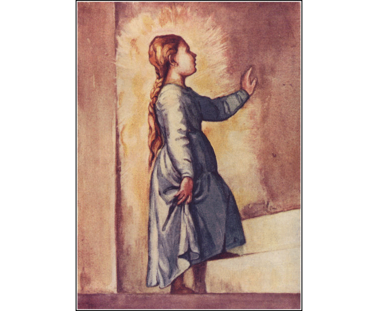 W E have seen how most of the great painters loved to paint into their pictures those scenes which they had known when they were boys, and which to the end of their lives they remembered clearly and vividly. Giotto never forgets the look of his sheep on the bare hillside of Vespignano, Fra Angelico paints his heavenly pictures with the colours of spring flowers found on the slopes of Fiesole, Perugino delights in the wide spaciousness of the Umbrian plains with the winding river and solitary cypresses. So when we come to the great Venetian painter Titian we look first with interest to see in what manner of a country he was born, and what were the pictures which Nature mirrored in his mind when he was still a boy. At the foot of the Alps, three days' journey from Venice, lies the little town of Cadore on the Pieve, and here it was that Titian was born. On every side rise great masses of rugged mountains towering up to the sky, with jagged peaks and curious fantastic shapes. Clouds float around their summits, and the mist will often wrap them in gloom and give them a strange and awesome look. At the foot of the craggy pass the mountain-torrent of the Pieve roars and tumbles on its way. Far-reaching forests of trees, with weather-beaten gnarled old trunks, stand firm against the mountain storms. Beneath their wide-spreading boughs there is a gloom almost of twilight, showing peeps here and there of deep purple distances beyond. Small wonder it was that Titian should love to paint mountains, and that he should be the first to paint a purely landscape picture. He lived those strange solemn mountains and the wild country round, the deep gloom of the woods and the purple of the distance beyond. The boy's father, Gregorio Vecelli, was one of the nobles of Cadore, but the family was not rich, and when Titian was ten years old he was sent to an uncle in Venice to be taught some trade. He had always been fond of painting, and it is said that when he was a very little boy he was found trying to paint a picture with the juices of flowers. His uncle, seeing that the boy had some talent, placed him in the studio of Giovanni Bellini. But though Titian learned much from Bellini, it was not until he first saw Giorgione's work that he dreamed of what it was possible to do with colour. Thenceforward he began to paint with that marvellous richness of colouring which has made his name famous all over the world. At first young Titian worked with Giorgione, and together they began to fresco the walls of the Exchange above the Rialto bridge. But by and by Giorgione grew jealous. Titian's work was praised too highly; it was even thought to be the better of the two. So they parted company, for Giorgione would work with him no more. Venice soon began to awake to the fact that in Titian she had another great painter who was likely to bring fame and honour to the fair city. He was invited to finish the frescoes in the Grand Council-chamber which Bellini had begun, and to paint the portraits of the Doges, her rulers. These portraits which Titian painted were so much admired that all the great princes and nobles desired to have themselves painted by the Venetian artist. The Emperor Charles V. himself when he stopped at Bologna sent to Venice to fetch Titian, and so delighted was he with his work that he made the painter a knight with a pension of two hundred crowns. Fame and wealth awaited Titian wherever he went, and before long he was invited to Rome that he might paint the portrait of the Pope. There it was that he met Michelangelo, and that great master looked with much interest at the work of the Venetian artist and praised it highly, for the colouring was such as he had never seen equalled before "It is most beautiful," he said afterwards to a friend; "but it is a pity that in Venice they do not teach men how to draw as well as how to colour. If this Titian drew as well as he painted, it would be impossible to surpass him." But ordinary eyes can find little fault with Titian's drawing, and his portraits are thought to be the most wonderful that ever were painted. The golden glow of Venice is cast like a magic spell over his pictures, and in him the great Venetian school of colouring reaches its height. Besides painting portraits, Titian painted many other pictures which are among the world's masterpieces. He must have had a special love for children, this famous old Venetian painter. We can tell by his pictures how well he understood them and how he loved to paint them. He would learn much by watching his own little daughter Lavinia as she played about the old house in Venice. His wife had died, and his eldest son was only a grief and disappointment to his father, but the little daughter was the light of his eyes. We seem to catch a glimpse of her face in his famous picture of the little Virgin going up the steps to the temple. The little maid is all alone, for she has left her companions behind, and the crowd stands watching her from below, while the high priest waits for her above. One hand is stretched out, and with the other she lifts her dress as she climbs up the marble steps. She looks a very real child with her long plait of golden hair and serious little face, and we cannot help thinking that the painter's own little daughter must have been in his mind when he painted the little Virgin.