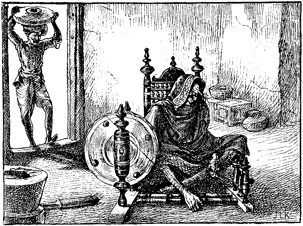 "Uncle!" said the maiden, "that jackal howls funnily. What does it say?" "Pooh!" returned the robber, "all jackals howl like that in this country." So poor pretty Bopolûchî journeyed on till they reached the robber's house. Then he told her who he was, and how he intended to marry her himself. She wept and cried bitterly, but the robber had no pity, and left her in charge of his old, oh! ever so old mother, while he went out to make arrangements for the marriage feast. Now Bopolûchî had such beautiful hair that it reached right down to her ankles, but the old mother hadn't a hair on her old bald head. "Daughter!" said the old, ever so old, mother, as she was putting the bridal dress on Bopolûchî, "how did you manage to get such beautiful hair?" "Well," replied Bopolûchî, "my mother made it grow by pounding my head in the big mortar for husking rice. At every stroke of the pestle my hair grew longer and longer. I assure you it is a plan that never fails." "Perhaps it would make my hair grow!" said the old woman eagerly. "Perhaps it would!" quoth cunning Bopolûchî. So the old, ever so old mother put her head in the mortar, and Bopolûchî pounded away with such a will that the old lady died. Then Bopolûchî dressed the dead body in the scarlet bridal dress, seated it on the low bridal chair, drew the veil well over the face, and put the spinning-wheel in front of it, so that when the robber came home he might think it was the bride. Then she put on the old mother's clothes, and seizing her own bundle, stepped out of the house as quickly as possible. On her way home she met the robber, who was returning with a stolen millstone, to grind the corn for the wedding feast, on his head. She was dreadfully frightened, and slipped behind the hedge, so as not to be seen. But the robber, not recognising her in the old mother's dress, thought she was some strange woman from a neighbouring village, and so to avoid being seen he slipped behind the other hedge. Thus Bopolûchî reached home in safety. Meanwhile, the robber, having come to his house, saw the figure in bridal scarlet sitting on the bridal chair, spinning, and of course thought it was Bopolûchî. So he called to her to help him down with the millstone, but she didn't answer. He called again, but still she didn't answer. Then he fell into a rage, and threw the millstone at her head. The figure toppled over, and lo and behold! it was not Bopolûchî at all, but his old, ever so old mother! Whereupon the robber wept, and beat his breast, thinking he had killed her; but when he discovered pretty Bopolûchî had run away, he became wild with rage, and determined to bring her back somehow.