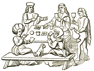 When ten or eleven o'clock had come, the horn was blown, the long tables were spread, and all gathered around them, whether rich or poor, noble or simple. Those to whom special honor was to be shown were seated "above the salt," that is, near the lord's end of the table and separated from the common folk by an elaborate salt-cellar. After the meal, there were games—chess, backgammon, cards, and checkers—and also music and dancing. Every visitor had some story to tell; the dogs lay about the hearth, and now and then one pricked up his ears and wagged his tail sleepily when he heard his master praise some exploit of his in the hunt. The flames blazed up merrily, and the gloomy hall became bright and cheerful. It was the very heart of home, and when a wounded knight lay dying in some foreign land, it was his own hall, which he should never see again, of which he thought with eager longing.