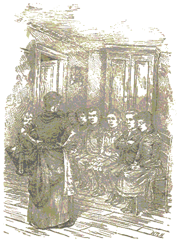 Breakfast was on the table promptly at seven o'clock, and there was very little of it, too; for it was an excellent day for short rations, though Mrs. Ruggles heaved a sigh as she reflected that the boys, with their India-rubber stomachs, would be just as hungry the day after the dinner-party as if they had never had any at all. As soon as the scanty meal was over, she announced the plan of the campaign: "Now Susan, you an' Kitty wash up the dishes; an' Peter, can't you spread up the beds, so 't I can git ter cuttin' out Larry's new suit? I ain't satisfied with his clo'es, an' I thought in the night of a way to make him a dress out o' my old red plaid shawl—kind o' Scotch style, yer know, with the fringe 't the bottom. . . . Eily, you go find the comb and take the snarls out the fringe, that 's a lady! You little young ones clear out from under foot! Clem, you and Con hop into bed with Larry while I wash yer underflannins; 't won't take long to dry 'em.—Yes, I know it 's bothersome, but yer can't go int' s'ciety 'thout takin' some trouble, 'n' anyhow I could n't git round to 'em last night. . . . Sarah Maud, I think 't would be perfeckly han'som if you ripped them brass buttons off yer uncle's policeman's coat 'n' sewed 'em in a row up the front o' yer green skirt. Susan, you must iron out yours 'n' Kitty's apurns; 'n' there, I come mighty near forgettin' Peory's stockin's! I counted the whole lot last night when I was washin' of 'em, 'n' there ain't but nineteen anyhow yer fix 'em, 'n' no nine pairs mates nohow; 'n' I ain't goin' ter have my childern wear odd stockin's to a dinner-comp'ny, fetched up as I was!—Eily, can't you run out and ask Mis' Cullen ter lend me a pair o' stockin's for Peory, 'n' tell her if she will, Peory 'll give her Jim half her candy when she gets home. Won't yer, Peory?" Peoria was young and greedy, and thought the remedy so out of all proportion to the disease that she set up a deafening howl at the projected bargain—a howl so rebellious and so out of season that her mother started in her direction with flashing eye and uplifted hand; but she let it fall suddenly, saying, "No, I vow I won't lick ye Christmas Day, if yer drive me crazy; but speak up smart, now, 'n' say whether yer 'd ruther give Jim Cullen half yer candy or go bare-legged ter the party?" The matter being put so plainly, Peoria collected her faculties, dried her tears, and chose the lesser evil, Clem having hastened the decision by an affectionate wink, that meant he 'd go halves with her on his candy. "That 's a lady!" cried her mother. "Now, you young ones that ain't doin' nothin', play all yer want ter before noontime, for after ye git through eatin' at twelve o'clock me 'n' Sarah Maud 's goin' ter give yer such a washin' 'n' combin' 'n' dressin' as yer never had before 'n' never will agin likely, 'n' then I 'm goin' to set yer down 'n' give yer two solid hours trainin' in manners; 'n' 't won't be no foolin' neither." "All we 've got ter do 's go eat!" grumbled Peter. "Well, that 's enough," responded his mother; "there 's more 'n one way of eatin', let me tell yer, 'n' you 've got a heap ter learn about it, Peter Ruggles. Land sakes, I wish you childern could see the way I was fetched up to eat. I never took a meal o' vittles in the kitchen before I married Ruggles; but yer can't keep up that style with nine young ones 'n' yer Pa always off ter sea." The big Ruggleses worked so well, and the little Ruggleses kept from "under foot" so successfully, that by one o'clock nine complete toilets were laid out in solemn grandeur on the beds. I say, "complete;" but I do not know whether they would be called so in the best society. The law of compensation had been well applied: he that had necktie had no cuffs; she that had sash had no handkerchief, and vice versa; but they all had shoes and a certain amount of clothing, such as it was, the outside layer being in every case quite above criticism. "Now, Sarah Maud," said Mrs. Ruggles, her face shining with excitement, "everything 's red up an' we can begin. I 've got a boiler 'n' a kettle 'n' a pot o' hot water. Peter, you go into the back bedroom, 'n' I 'll take Susan, Kitty, Peory 'n' Cornelius; 'n' Sarah Maud, you take Clem, 'n' Eily, 'n' Larry, one to a time. Scrub 'em 'n' rinse 'em, or 't any rate git 's fur 's you can with 'em, and then I 'll finish 'em off while you do yerself." Sarah Maud could n't have scrubbed with any more decision and force if she had been doing floors, and the little Ruggleses bore it bravely, not from natural heroism, but for the joy that was set before them. Not being satisfied, however, with the tone of their complexions, and feeling that the number of freckles to the square inch was too many to be tolerated in the highest social circles, she wound up operations by applying a little Bristol brick from the knife-board, which served as the proverbial "last straw," from under which the little Ruggleses issued rather red and raw and out of temper. When the clock struck four they were all clothed, and most of them in their right minds, ready for those last touches that always take the most time. Kitty's red hair was curled in thirty-four ringlets, Sarah Maud's was braided in one pig-tail, and Susan's and Eily's in two braids apiece, while Peoria's resisted all advances in the shape of hair oils and stuck out straight on all sides, like that of the Circassian girl of the circus, so Clem said; and he was sent into the bedroom for it, too, from whence he was dragged out forgivingly, by Peoria herself, five minutes later. Then, exciting moment, came linen collars for some and neckties and bows for others,—a magnificent green glass breastpin was sewed into Peter's purple necktie,—and Eureka! the Ruggleses were dressed, and Solomon in all his glory was not arrayed like one of these! A row of seats was formed directly through the middle of the kitchen. Of course there were not quite chairs enough for ten, since the fami