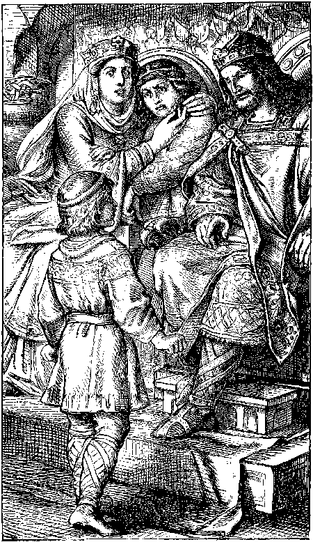 O SMOND DE CENTEVILLE was soon convinced that no immediate peril threatened his young Duke at the Court of Laon. Louis seemed to intend to fulfil his oaths to the Normans by allowing the child to be the companion of his own sons, and to be treated in every respect as became his rank. Richard had his proper place at table, and all due attendance; he learnt, rode, and played with the Princes, and there was nothing to complain of, excepting the coldness and inattention with which the King and Queen treated him, by no means fulfilling the promise of being as parents to their orphan ward. Gerberge, who had from the first dreaded his superior strength and his roughness with her puny boys, and who had been by no means won by his manners at their first meeting, was especially distant and severe with him, hardly ever speaking to him except with some rebuke, which, it must be confessed, Richard often deserved. As to the boys, his constant companions, Richard was on very friendly terms with Carlo-man, a gentle, timid, weakly child. Richard looked down upon him; but he was kind, as a generous-tempered boy could not fail to be, to one younger and weaker than himself. He was so much kinder than Lothaire, that Carloman was fast growing very fond of him, and looked up to his strength and courage as something noble and marvellous. It was very different with Lothaire, the person from whom, above all others, Richard would have most expected to meet with affection, as his father's god-son, a relationship which in those times was thought almost as near as kindred by blood. Lothaire had been brought up by an indulgent mother, and by courtiers who never ceased flattering him, as the heir to the crown, and he had learnt to think that to give way to his naturally imperious and violent disposition was the way to prove his power and assert his rank. He had always had his own way, and nothing had ever been done to check his faults; somewhat weakly health had made him fretful and timid; and a latent consciousness of this fearfulness made him all the more cruel, sometimes because he was frightened, sometimes because he fancied it manly. He treated his little brother in a way which in these times boys would call bullying; and, as no one ever dared to oppose the King's eldest son, it was pretty much the same with every one else, except now and then some dumb creature, and then all Lothaire's cruelty was shown. When his horse kicked, and ended by throwing him, he stood by, and caused it to be beaten till the poor creature's back streamed with blood; when his dog bit his hand in trying to seize the meat with which he was teazing it, he insisted on having it killed, and it was worse still when a falcon pecked one of his fingers. It really hurt him a good deal, and, in a furious rage, he caused two nails to be heated red hot in the fire, intending to have them thrust into the poor bird's eyes. "I will not have it done!" exclaimed Richard, expecting to be obeyed as he was at home; but Lothaire only laughed scornfully, saying, "Do you think you are master here, Sir pirate?" "I will not have it done!" repeated Richard. "Shame on you, shame on you, for thinking of such an unkingly deed." "Shame on me! Do you know to whom you speak, master savage?" cried Lothaire, red with passion. "I know who is the savage now!" said Richard. "Hold!" to the servant who was bringing the red-hot irons in a pair of tongs. "Hold?" exclaimed Lothaire. "No one commands here but I and my father. Go on Charlot—where is the bird? Keep her fast, Giles." "Osmond. You I can command—" "Come away, my Lord," said Osmond, interrupting Richard's order, before it was issued. "We have no right to interfere here, and cannot hinder it. Come away from such a foul sight." "Shame on you too, Osmond, to let such a deed be done without hindering it!" exclaimed Richard, breaking from him, and rushing on the man who carried the hot irons. The French servants were not very willing to exert their strength against the Duke of Normandy, and Richard's onset, taking the man by surprise, made him drop the tongs. Lothaire, both afraid and enraged, caught them up as a weapon of defence, and, hardly knowing what he did, struck full at Richard's face with the hot iron. Happily it missed his eye, and the heat had a little abated; but, as it touched his cheek, it burnt him sufficiently to cause considerable pain. With a cry of passion, he flew at Lothaire, shook him with all his might, and ended by throwing him at his length on the pavement. But this was the last of Richard's exploits, for he was at the same moment captured by his Squire, and borne off, struggling and kicking as if Osmond had been his greatest foe; but the young Norman's arms were like iron round him; and he gave over his resistance sooner, because at that moment a whirring flapping sound was heard, and the poor hawk rose high, higher, over their heads in ever lessening circles, far away from her enemies. The servant who held her, had relaxed his grasp in the consternation caused by Lothaire's fall, and she was mounting up and up, spying, it might be, her way to her native rocks in Iceland, with the yellow eyes which Richard had saved. "Safe! safe!" cried Richard, joyfully, ceasing his struggles. "Oh, how glad I am! That young villain should never have hurt her. Put me down, Osmond, what are you doing with me?" "Saving you from your—no, I cannot call it folly,—I would hardly have had you stand still to see such—but let me see your face." "It is nothing. I don't care now the hawk is safe," said Richard, though he could hardly keep his lips in order, and was obliged to wink very hard with his eyes to keep the tears out, now that he had leisure to feel the smarting; but it would have been far beneath a Northman to complain, and he stood bearing it gallantly, and pinching his fingers tightly together, while Osmond knelt down to examine the hurt. "'Tis not much," said he, talking to himself, "half bruise, half b