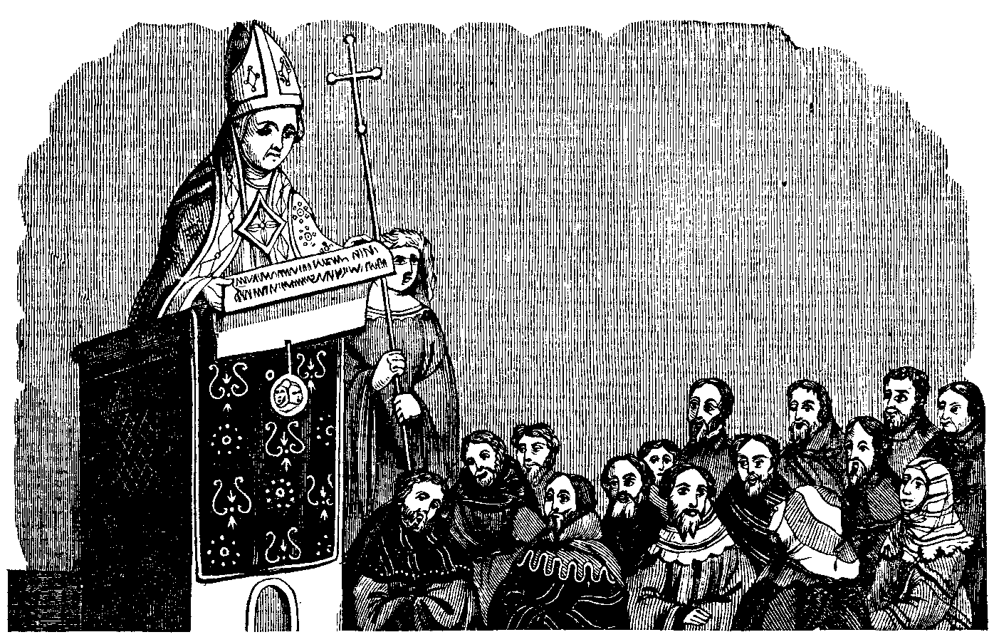 On the adjoining page we have an engraving, copied from a very ancient book, representing an archbishop reading a bull to the people in a church. You can see the boss of metal, with the seal stamped upon it, hanging down from the parchment.