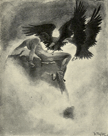 "Thus years upon years passed, and ages circled by, until thirteen generations of men had lived and died upon the earth. Then came Heracles, the descendant of Io, to purge the world of vile monsters, and to give freedom to those who were in bonds. And as he wandered from land to land, to do the bidding of his master Eurystheus, he passed through Ethiopia, and came to the region of the Caucasus, close by the eastern Ocean's stream. There, as he gazed upward at the everlasting peaks, he saw the great Titan fettered to the naked rock, while the eagles circled about him, and the grim vulture digged its talons into his flesh; and Heracles knew that this was Prometheus the ancient, the friend of the human race and the foe of tyrants. He drew his bow, and with his unerring arrows slew the eagles and the vulture; and then, with mighty blows of his club, he broke the chains which Hephaestus of old had wrought, and with his strong hands he loosed the long-suffering prisoner from his fetters. And the earth rejoiced; and men everywhere sang pæans of triumph, because freedom had been given to him who raised them from the dust, and endowed them with the light of reason and the fire of god-like intelligence."