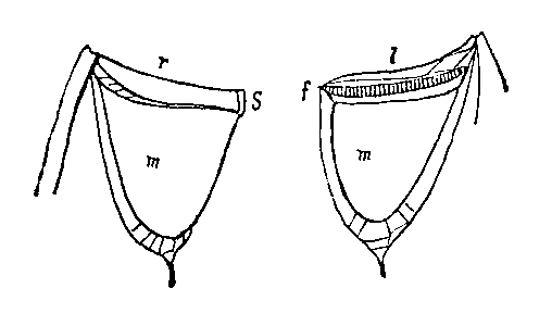 The front portions of the wings of a male katydid showing file on one wing and scraper on the other.
